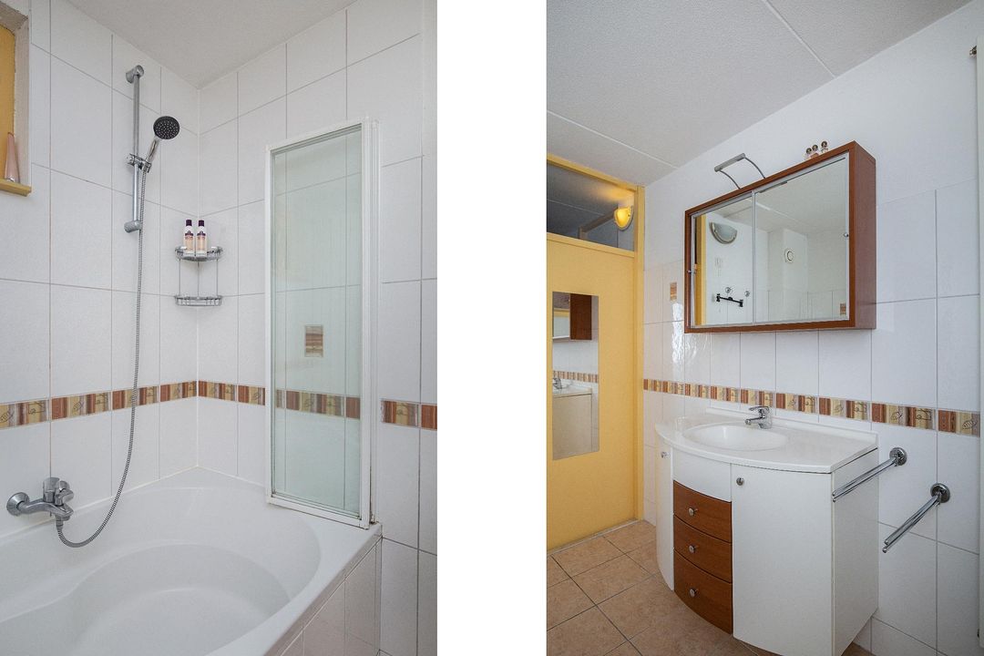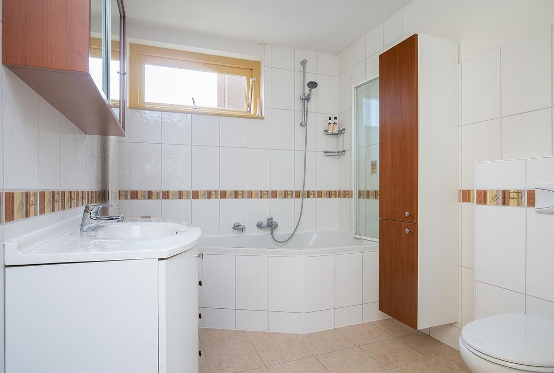 De badkamer is vrijwel geheel betegeld: aan de wanden is er gekozen voor een witte wandtegel in combinatie met een sierlijst die in kleur perfect matched met de lichte vloertegel. De ruimte heeft een wastafel met meubel, een zitbad met handdouche en een hangend toilet. De ventilatie kunt u eenvoudig regelen middels het mechanische ventilatiesysteem én het openslaande raam.