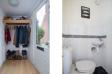 Through the front door you enter the lobby with access to the living room and the meter cupboard. From the reception hall, the light oak laminate floor is completely laid over the floor, with the exception of the toilet. The same goes for the neat white finish on both the ceiling and the walls.