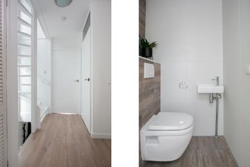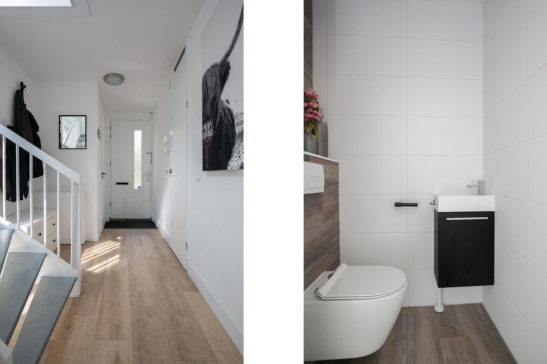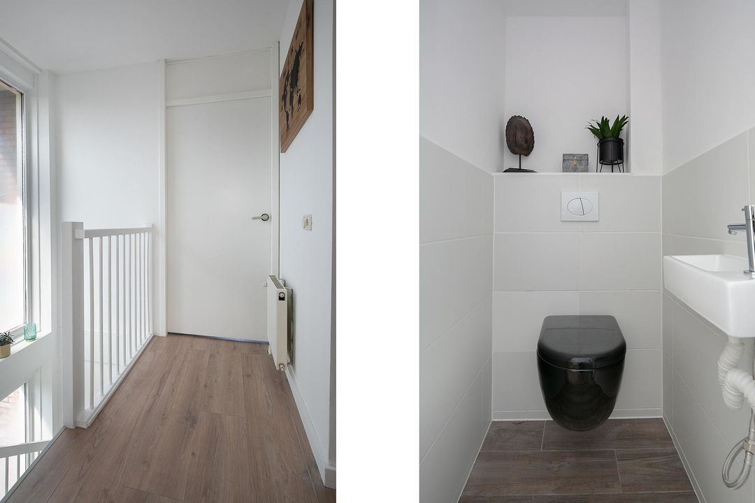 De toiletruimte is volledig betegeld met een witte vloertegel in combinatie met een ‘houtlook’ tegel op de achterwand van het toilet. Er is een hangend toilet aanwezig, een wastafel met meubel en de ventilatie is te regelen middels het mechanische ventilatiesysteem.