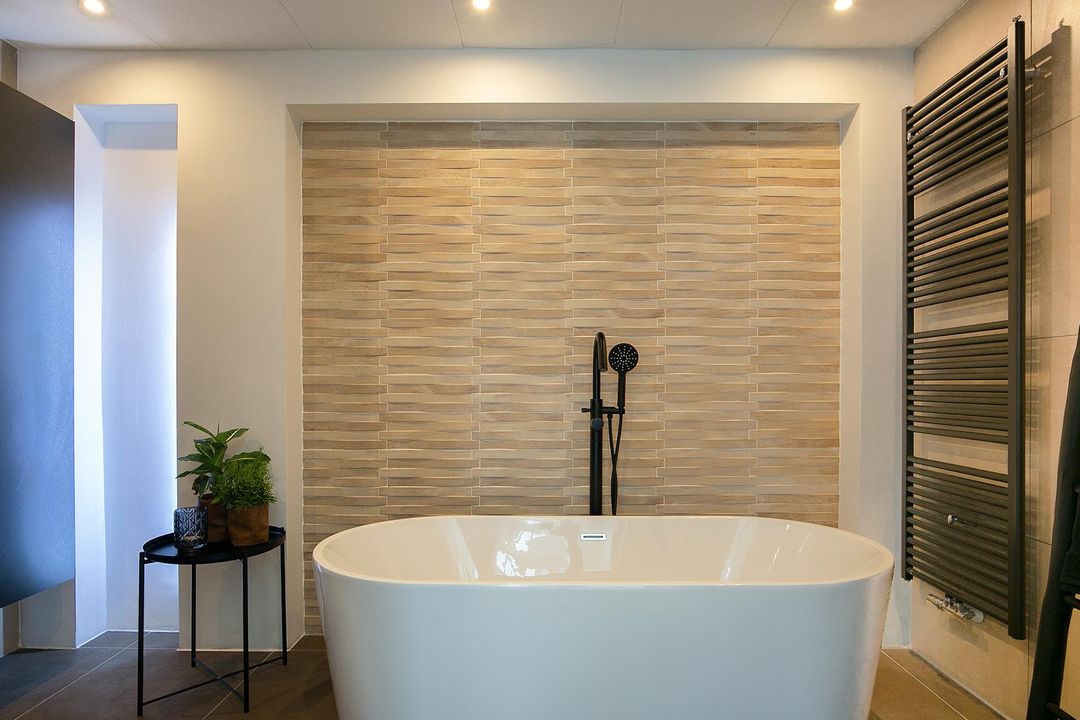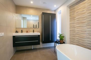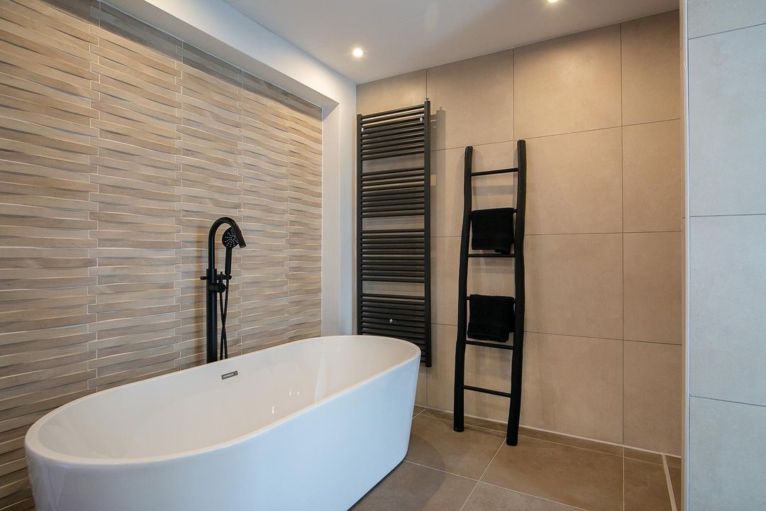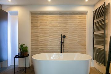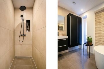 Deze moderne badkamer straalt één-en-al warmte uit! Badkamer is vrijwel geheel betegeld met een taupekleurige vloertegel en een licht crème wandtegel. De wand aan de zijkant van de woning is gestukt, in combinatie met crèmekleurige siertegels en heeft een groot raam waardoor de badkamer wordt voorzien van daglicht. Tevens heeft de ruimte diverse inbouwspots in het plafond. Daarnaast heeft u een dubbele wastafel met designmeubel(s), een ligbad, een inloopdouche met regen- en handdouche en is er een designradiator aanwezig. De ventilatie is te regelen middels het mechanische ventilatiesysteem.