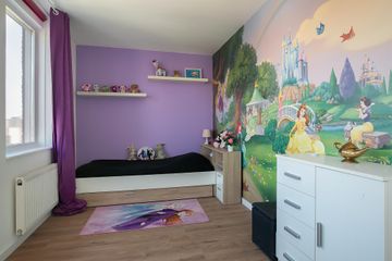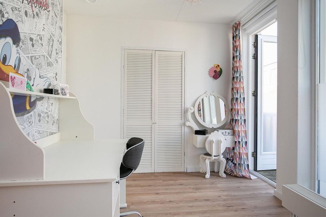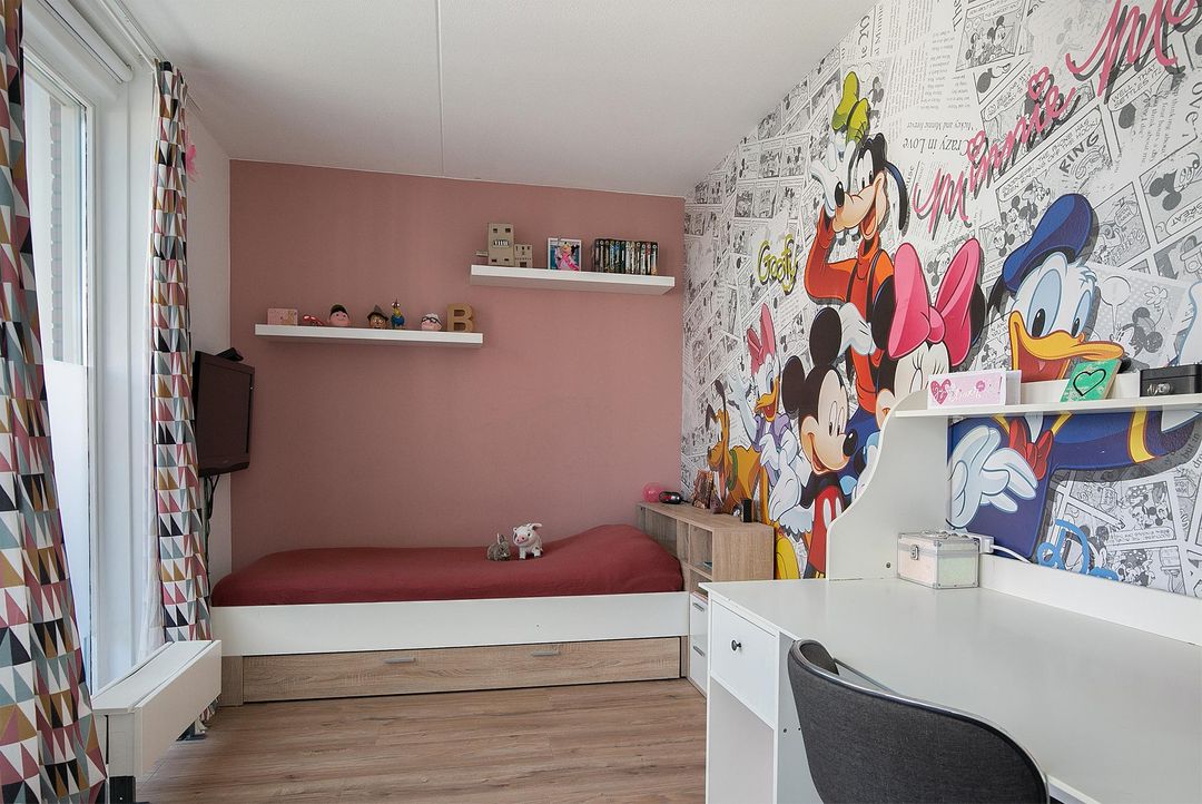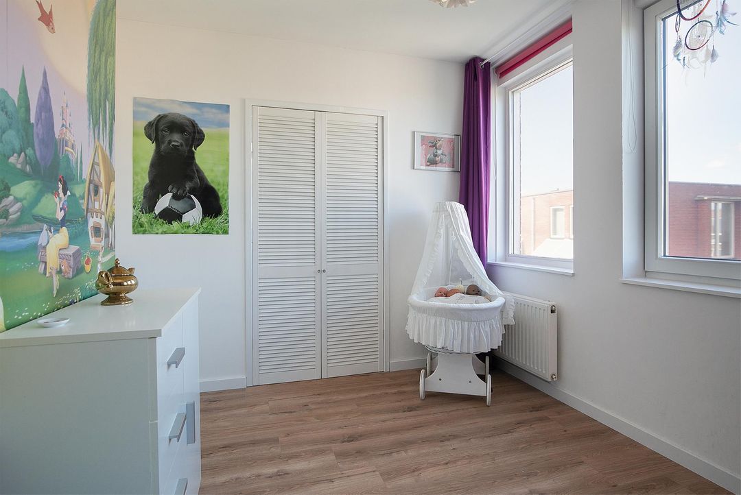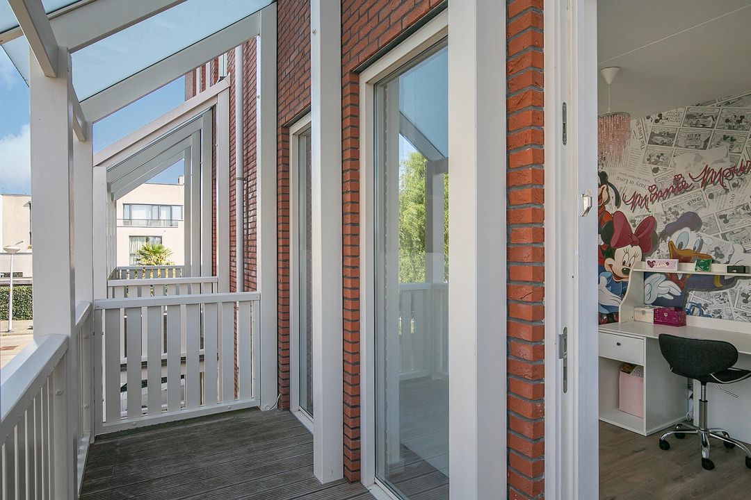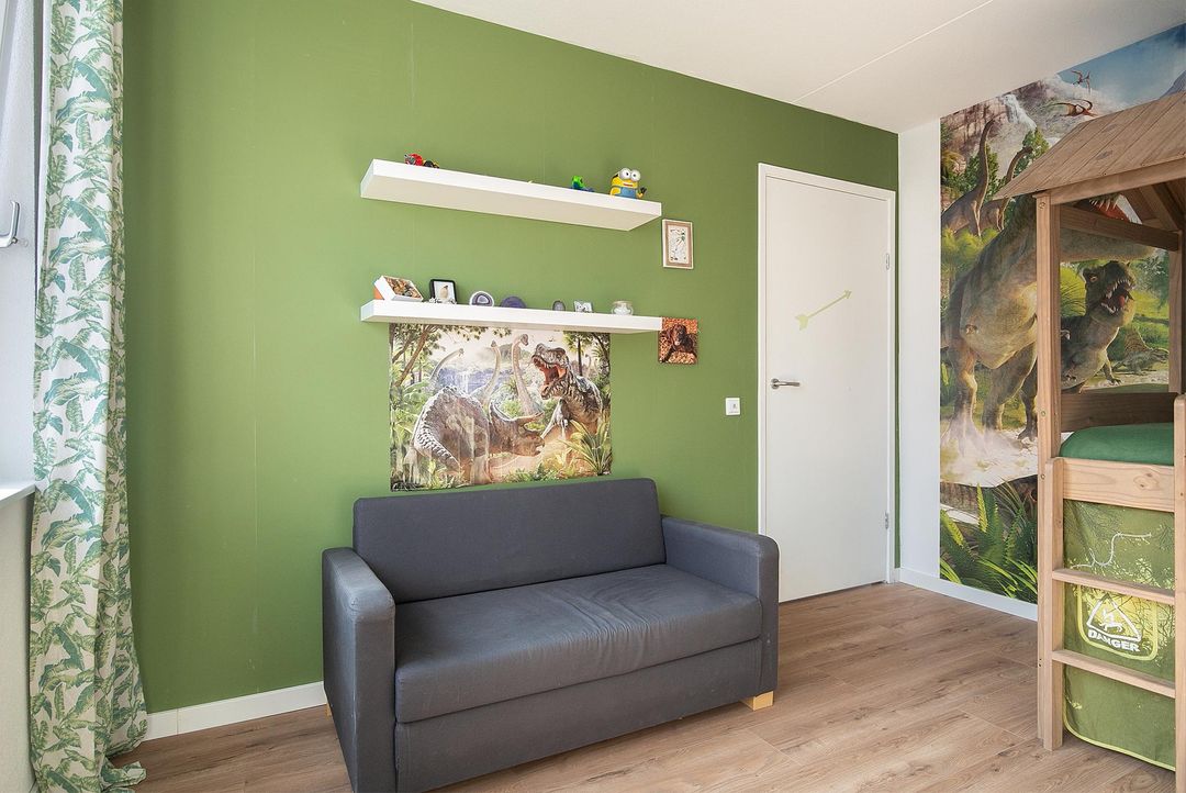 De verdieping heeft 3 slaapkamers waarvan 2 royale. Slaapkamer 1 heeft een ruime inbouwkledingkast, 2 grote raampartijen en een loopdeur naar het balkon (6m2). Slaapkamer 2 heeft een groene wandafwerking in combinatie met sierbehang en heeft 2 grote draaikiepramen. De 3 slaapkamer is momenteel ingericht als kantoorruimte/werkplek.