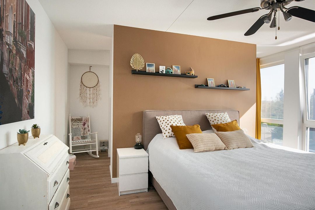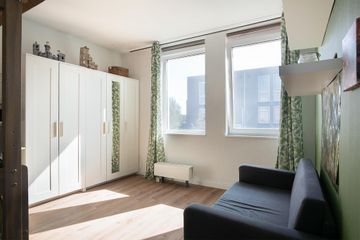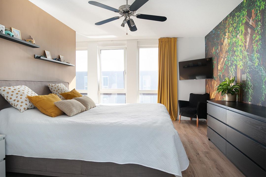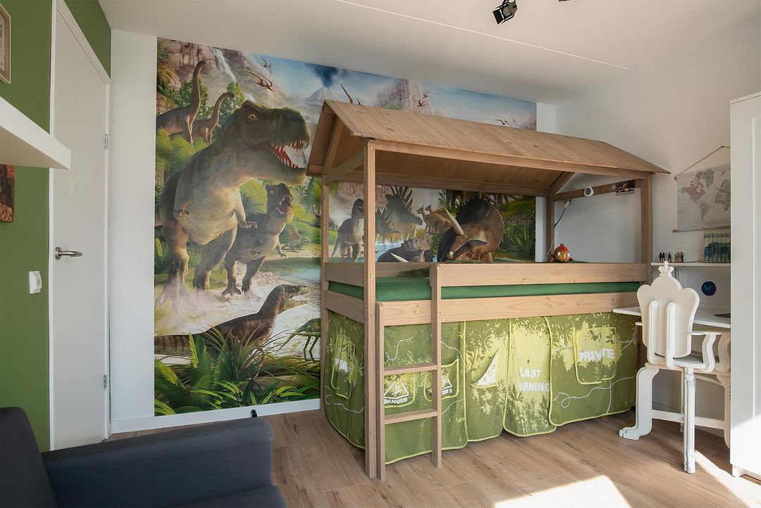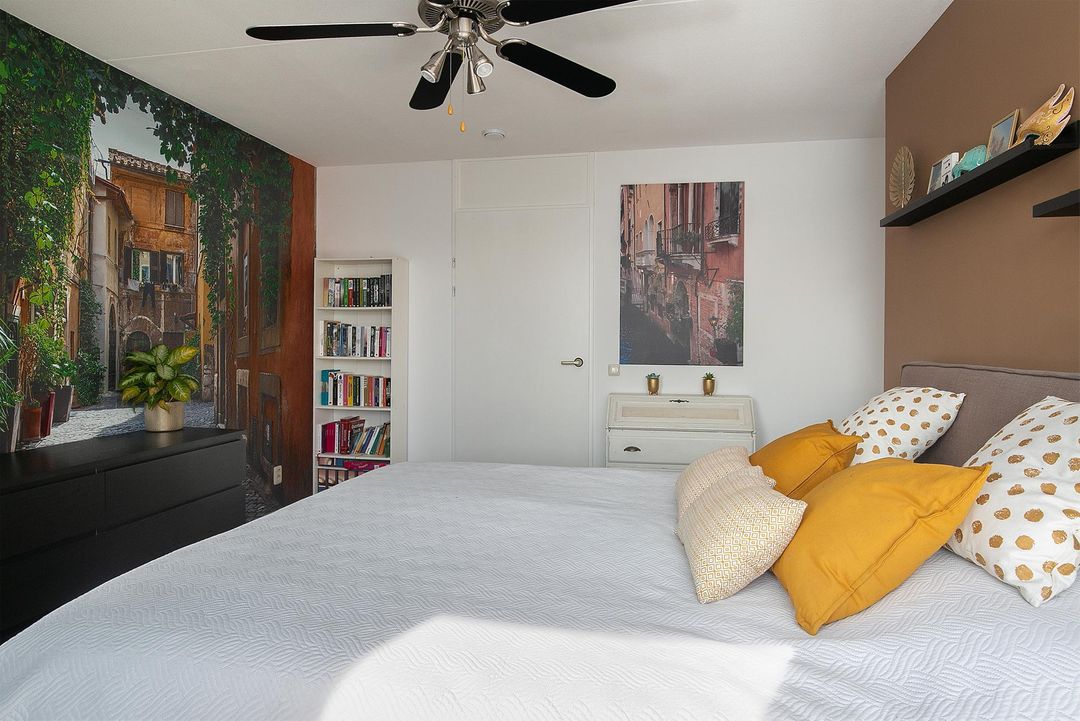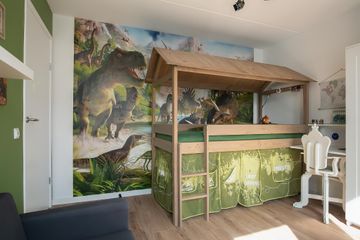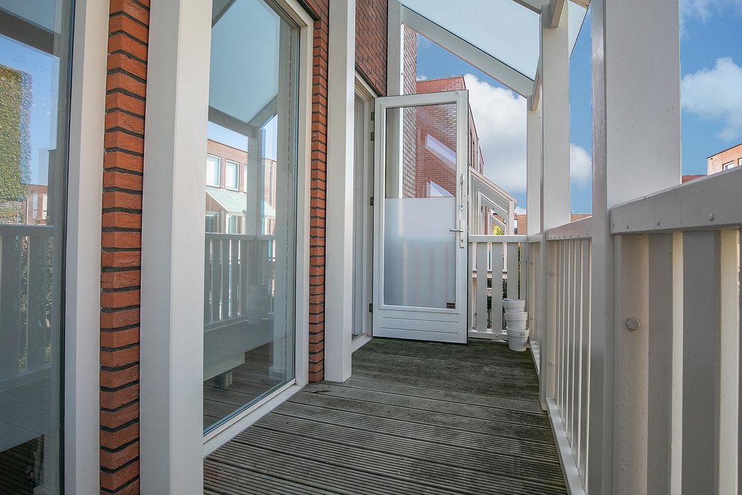 De verdieping heeft 3 slaapkamers waarvan 2 royale. Slaapkamer 1 heeft een ruime inbouwkledingkast, 2 grote raampartijen en een loopdeur naar het balkon (6m2). Slaapkamer 2 heeft een groene wandafwerking in combinatie met sierbehang en heeft 2 grote draaikiepramen. De 3 slaapkamer is momenteel ingericht als kantoorruimte/werkplek.