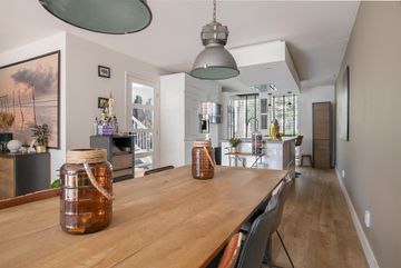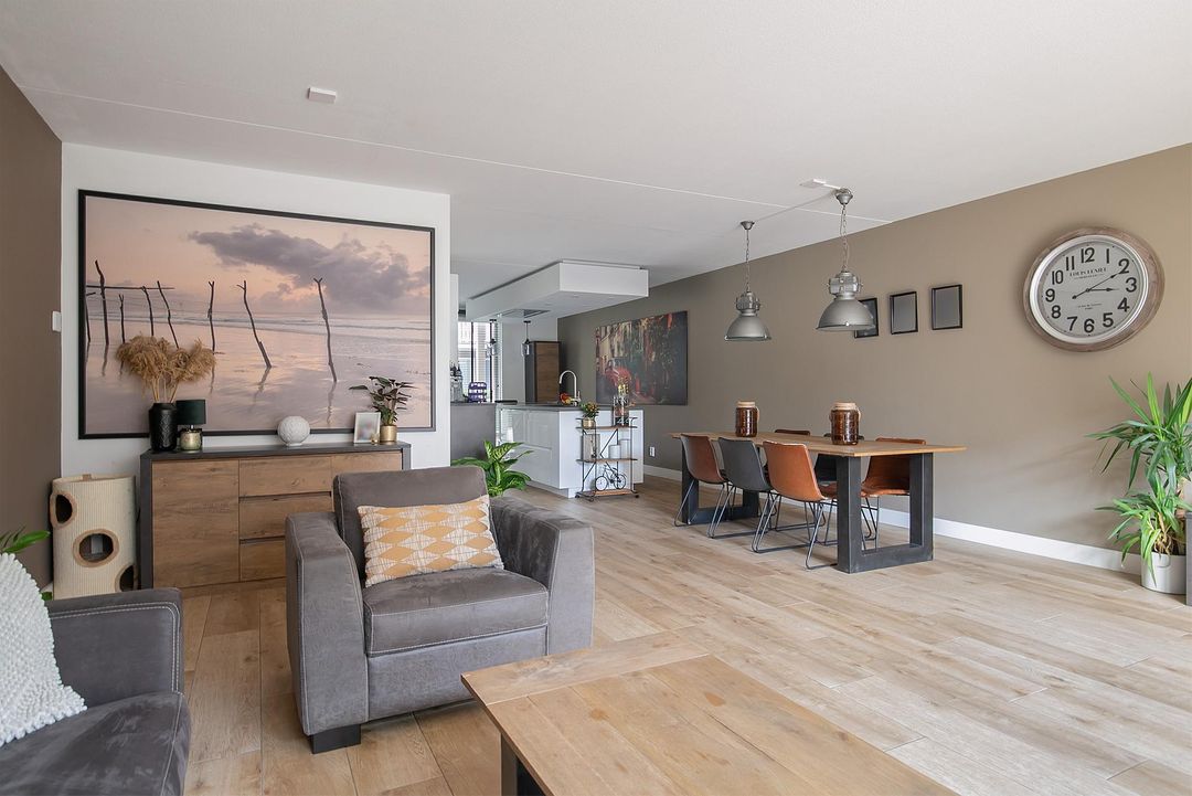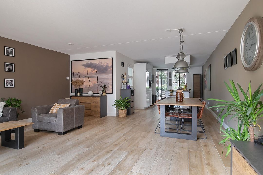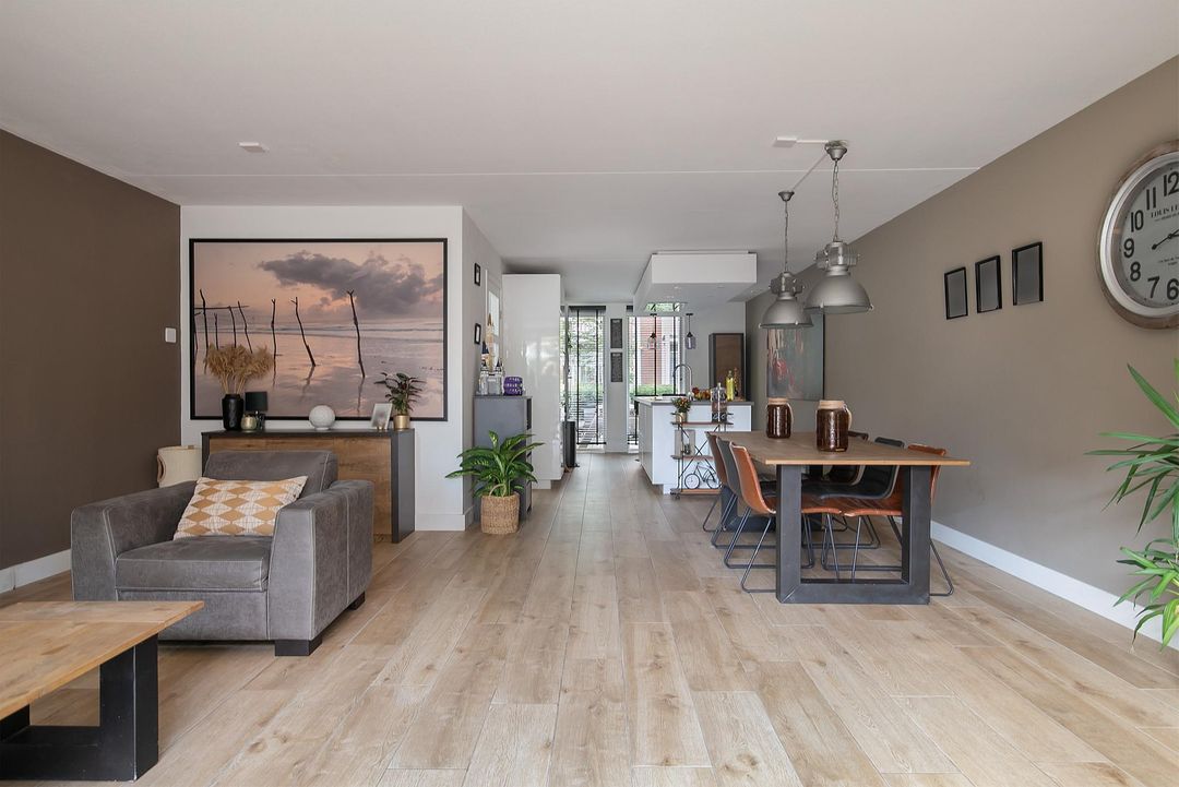 De lichte en tevens brede woonkamer met open keuken is ruim 12 meter diep en biedt volop mogelijkheden voor een gezellig zitgedeelte en een apart eetgedeelte. De openslaande deuren bieden toegang tot de achtertuin. Op de strak gestucte wanden is er gekozen voor een witte wandafwerking in combinatie met grijs/groene wanden.