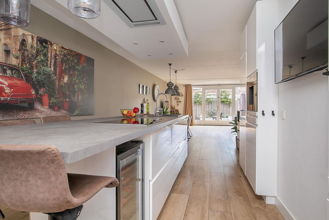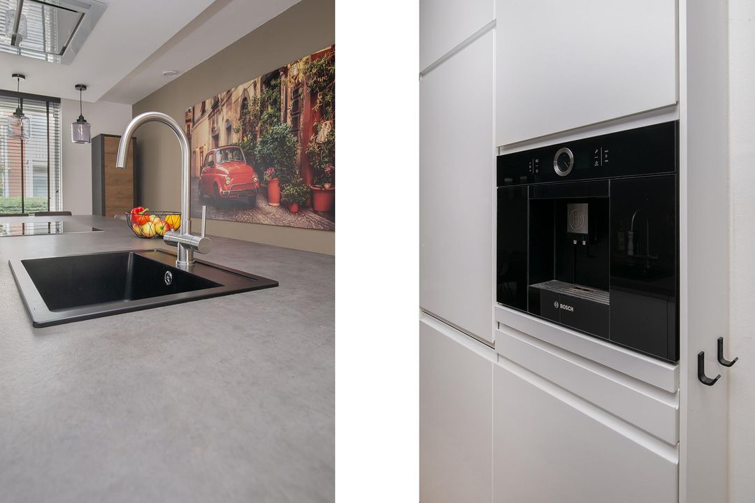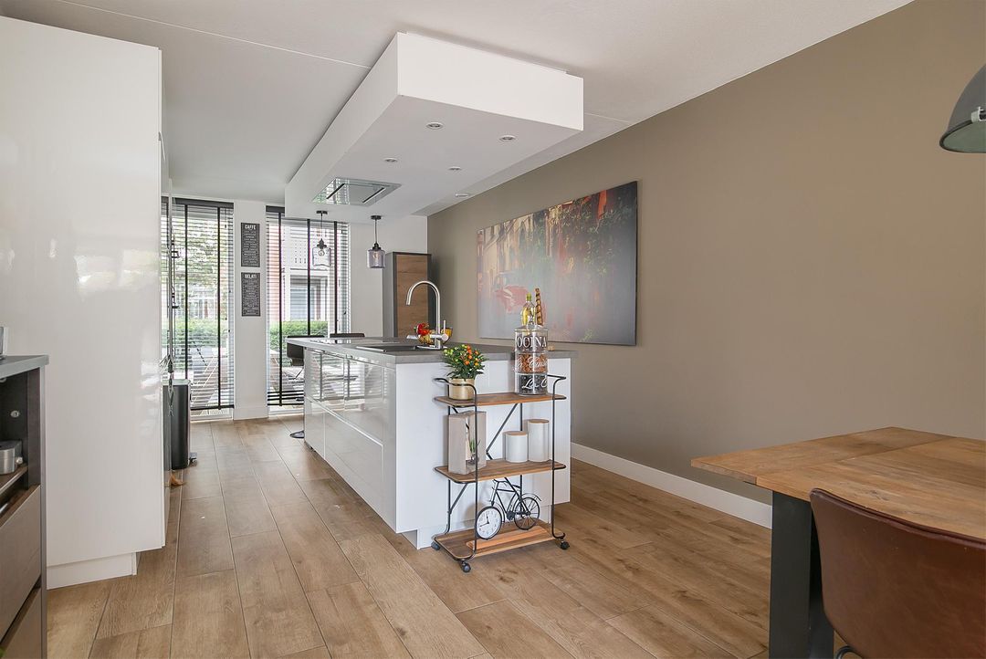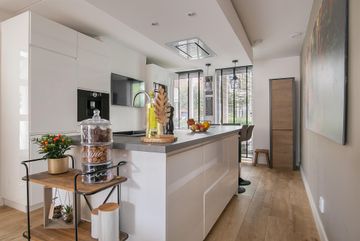 De open keuken ligt aan de voorzijde en wat hier direct opvalt is de fijne lichtinval door de aanwezigheid van 2 hoge ramen. Het is een moderne keuken die van alle gemakken is voorzien! Zo kunt u heerlijk tafelen aan de bar van het kookeiland. Het kookeiland heeft een donkergrijs kunststof werkblad met een zwarte spoelbak en een 5 pits inductie kookplaat. In het verlaagde plafond boven het eiland heeft u een nette afzuigkap boven de kookplaat en een combinatie van inbouwspots en hangende lampjes. De vele opbergkasten zijn voorzien van hoogglans witte panelen. Zo ook op de kastenopstelling parallel aan het kookeiland. Hier vindt u ook de 2 koel- en vriescombinaties, 2 combiovens (oven-stoomoven + stoomoven-magnetron), een koffiezet apparaat en een tv-aansluiting.