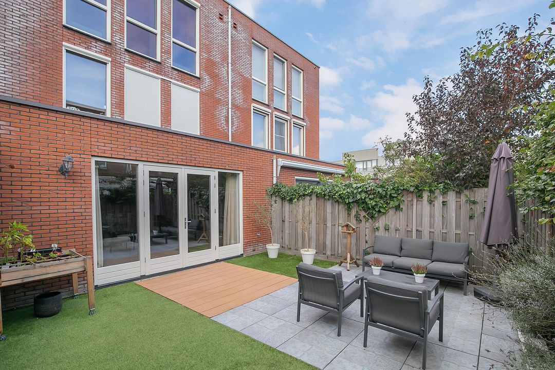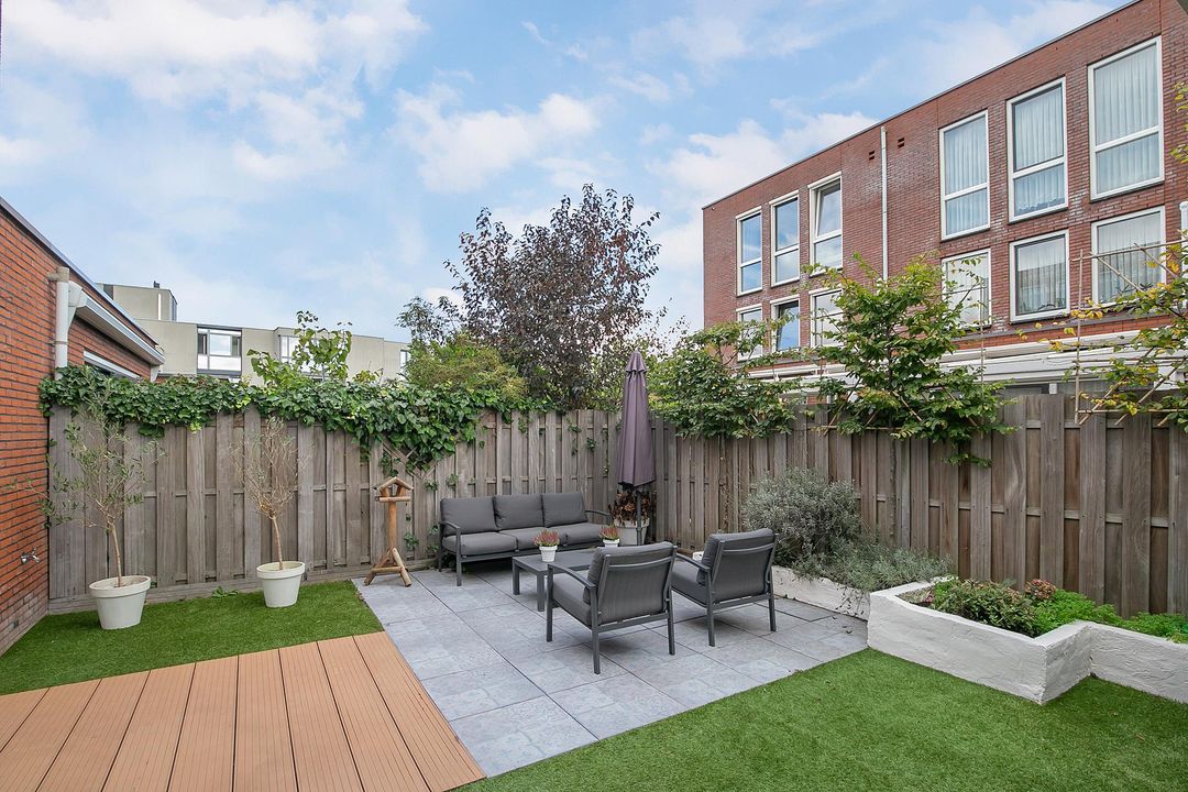 Deze heerlijke tuin (60m2) is gelegen op het zuidoosten en is in 2020 helemaal vernieuwd! De tuin betreedt u middels de 2 openslaande deuren vanuit de woonkamer, de garage óf de achterom. Er is gekozen voor een terras met grijze tegels in combinatie met kunstgras, plantenborders en kunststof vlonderdelen. Daarnaast kunt heerlijk tafelen onder de veranda met toegang naar de garage. De garage is 17 m2 groot en voorzien van elektra.