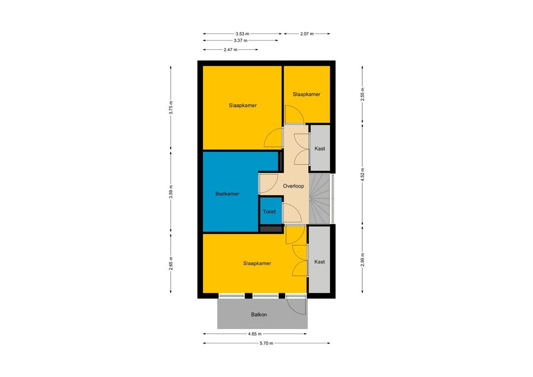Middels de vaste trap op de begane grond betreedt u de overloop op de eerste verdieping. Evenals in de hal, heeft u hier grote raampartijen bij de trap waardoor de overloop een zeer aangename lichtinval heeft. Via de overloop heeft u toegang tot de badkamer, de separate toiletruimte een bergkast, de trap naar de 2e verdieping en natuurlijk tot de 3 slaapkamers. De lichte laminaatvloer is doorgelegd over de gehele verdieping m.u.v. van de badkamer en het toilet.