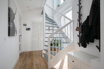 De veranda aan de voorzijde geeft deze woning een speels uiterlijk en hier is het ook nog eens leuk zitten op een zomerse dag! De entree bevindt zich aan de voorzijde en geeft toegang tot de hal. De ontvangsthal is zeer ruim opgezet en doordat de woning twee-onder-een kap is, zijn er grote raampartijen die de ruimte van daglicht voorzien. Middels de hal heeft u toegang tot het toilet, de meterkast, de woonkamer, een opbergkast en de vaste trap naar de eerste verdieping. Vanuit de ontvangsthal is de licht eiken keramische parketvloer, inclusief de vloerverwarming, geheel doorgelegd over de gehele verdieping.