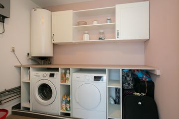 Ideaal is de wasruimte op deze verdieping! De ruimte is netjes afgewerkt en u heeft een aantal kasten met een werkblad waarin u uw wasmachine en droger kunt plaatsen. Ook treft u hier de omvormer voor de 14 zonnepanelen, de elektrische boiler (120 liter) en de Nefit cv-ketel.