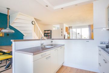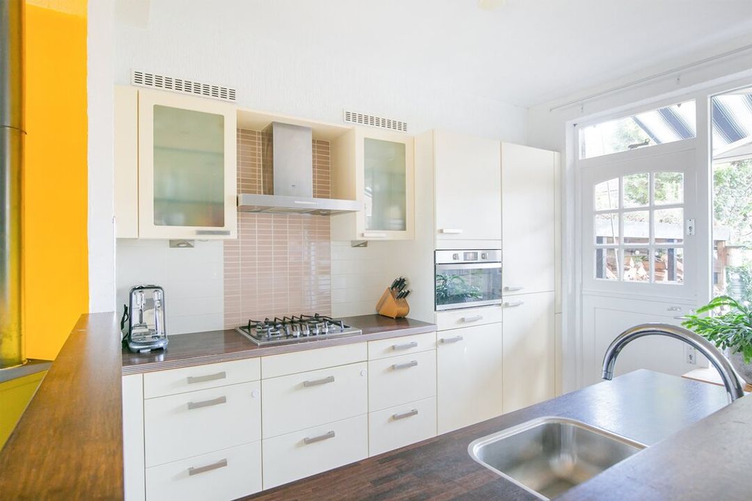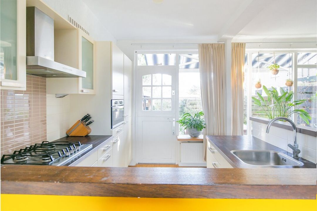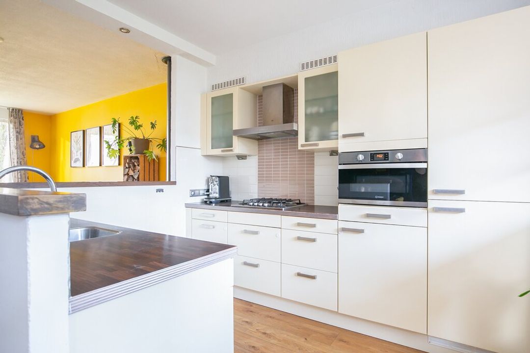 Aan deze open, en zeer ruime keuken hoef je niks meer te doen. De keuken heeft 2 keukenbokken: Aan de wandzijde heeft u veel opbergruimte door de vele kasten, welke zijn afgewerkt met gebroken witte panelen. Het werkblad is aan weerszijde van hout en past perfect bij de kleur van de kastjes. Daarnaast is de keuken voorzien van inbouwapparatuur zoals de koelkast, combi-oven, de vaatwasser, RVS afzuigkap en de 4 pits gaskookplaat. De vaatwasser staat evenals de RVS spoelbak in het keuken blok parallel aan het eerste keukenblok en is tevens voorzien van extra opbergkasten.