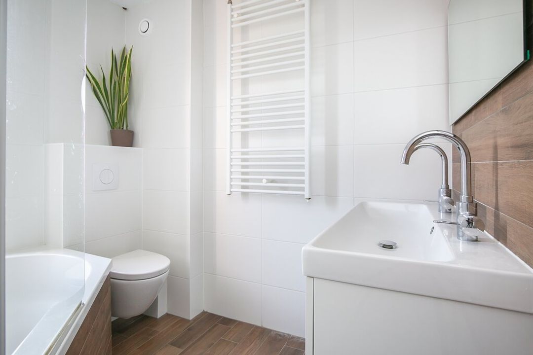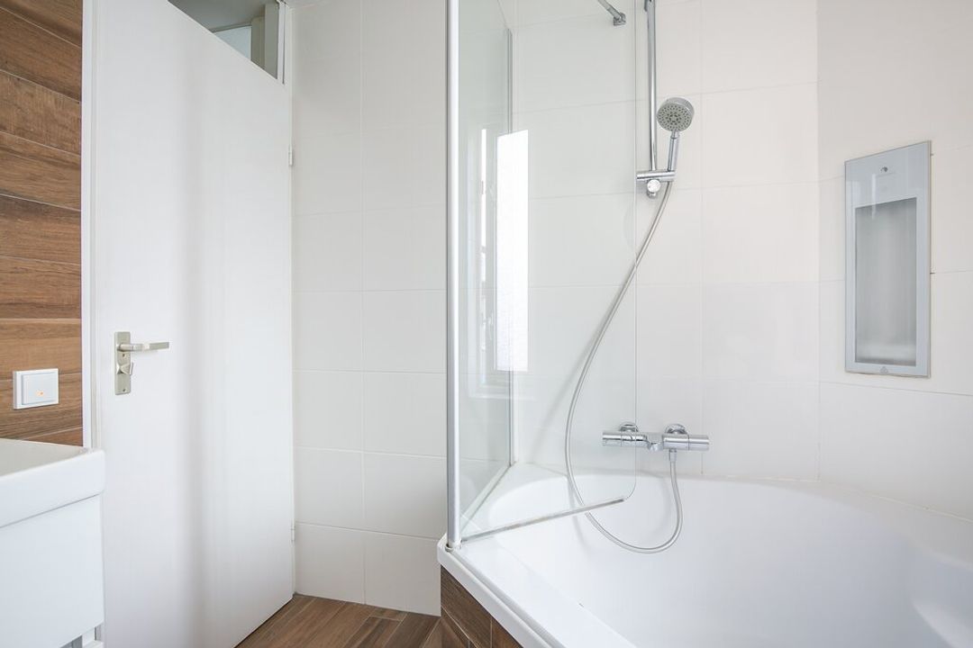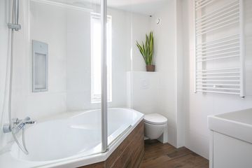 Zeer nette badkamer met alle voorzieningen die u nodig heeft! De badkamer is afgewerkt met houtlook tegel welke doorloopt tegen de rand van het bad én de wand van het wastafelmeubel. De wanden zijn voorzien van een brede, witte wandtegel. De badkamer heeft een ruim ligbad met douche, een zwevend toilet, en een ruime wastafelmeubel ruime wasbak voorzien van 2 RVS kranen. De ventilatie is te regelen middels het mechanische ventilatiesysteem en het openslaande raampje.