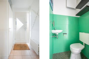 Deze ruimte is afgewerkt met een groene wandtegel tot de helft van de wand, en loopt door met een witte afwerking naar het plafond. De ruimte is voorzien van een staande toilet, fontein en een radiator.
