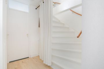 Bij binnenkomst treft u de hal. Deze geeft ruimte naar de toilet ruimte, meterkast en de deur naar de woonkamer. Zowel de wanden als het plafond hebben een wit geschilderde afwerking. De vloer is betegeld met een beige vloertegel.
