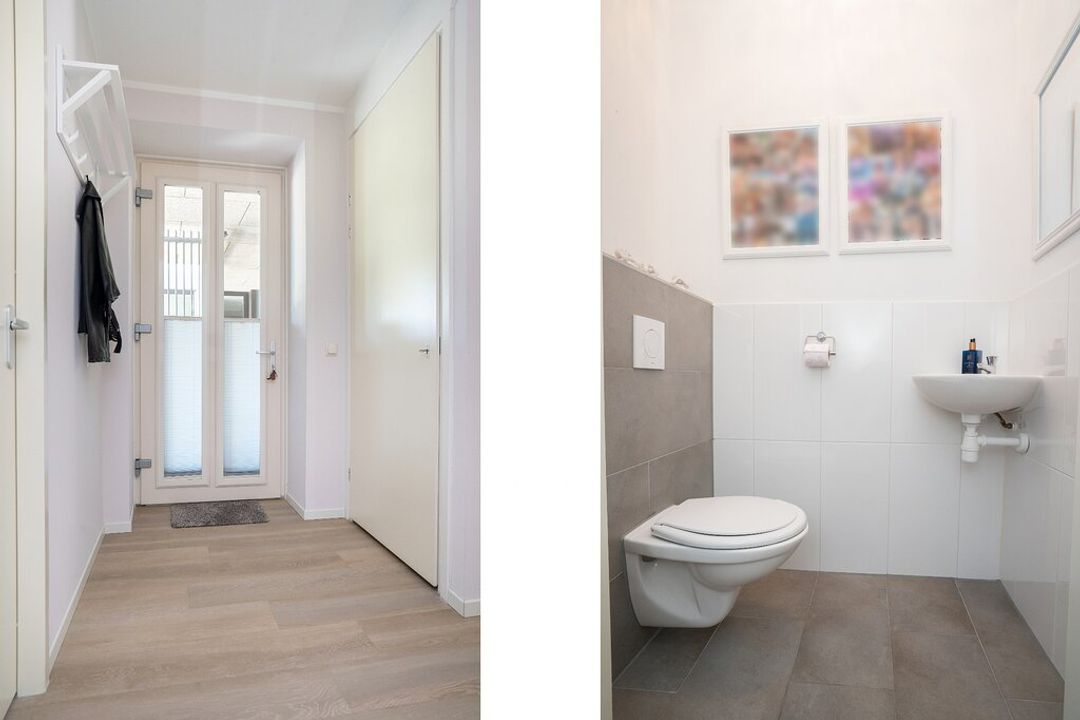 De toiletruimte is half betegeld met een lichtgrijze vloertegel, deze loopt door tegen te achterwand van het hangende toilet waarvan de spoelbak netjes in is weggewerkt. Alle andere wanden zijn afgewerkt met witte wandtegels. Daarnaast is de ruimte voorzien van een fonteintje en een mechanisch ventilatiesysteem.