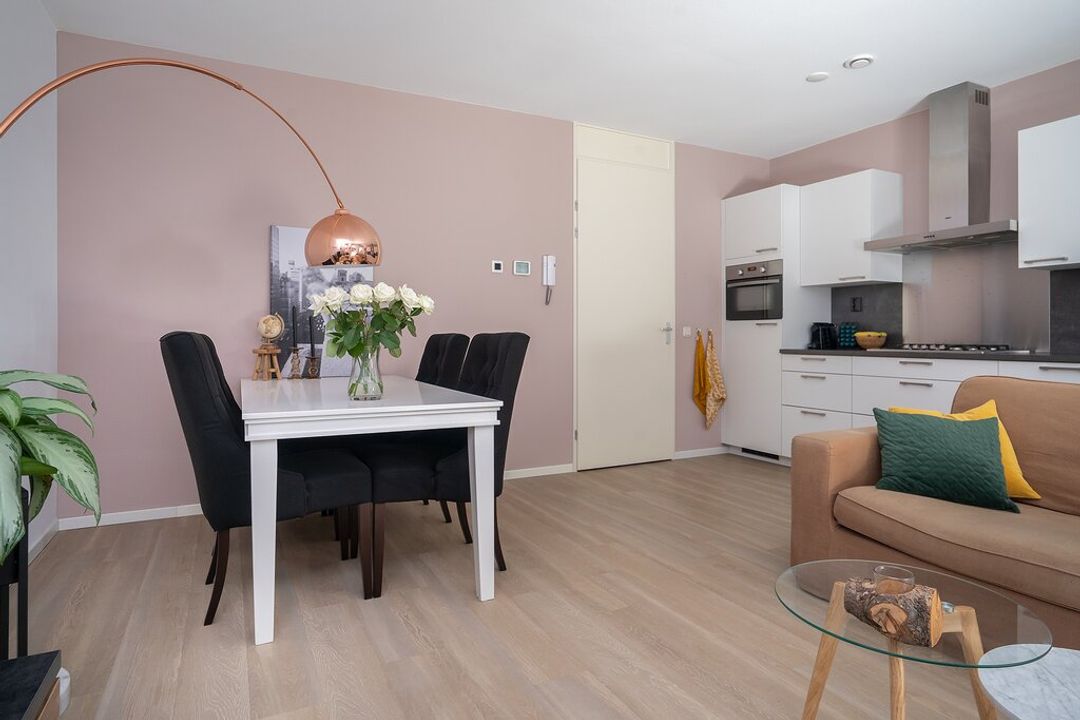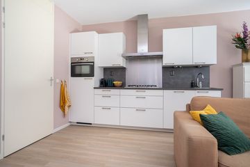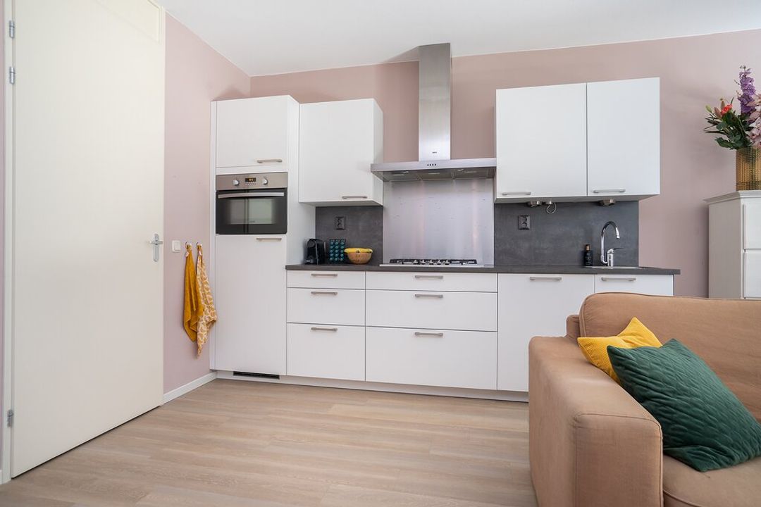 De woonkamer is ruim van opzet en heeft een prettige lichtinval door de 2 grote draaikiepramen en de glazen openslaande deur naar het zeer ruime terras op het zuidwesten. De wanden zijn afgewerkt met strak wit schilderwerk in combinatie met 2 lichtroze wanden. Daarnaast biedt de woonkamer ruimte voor de open keuken.