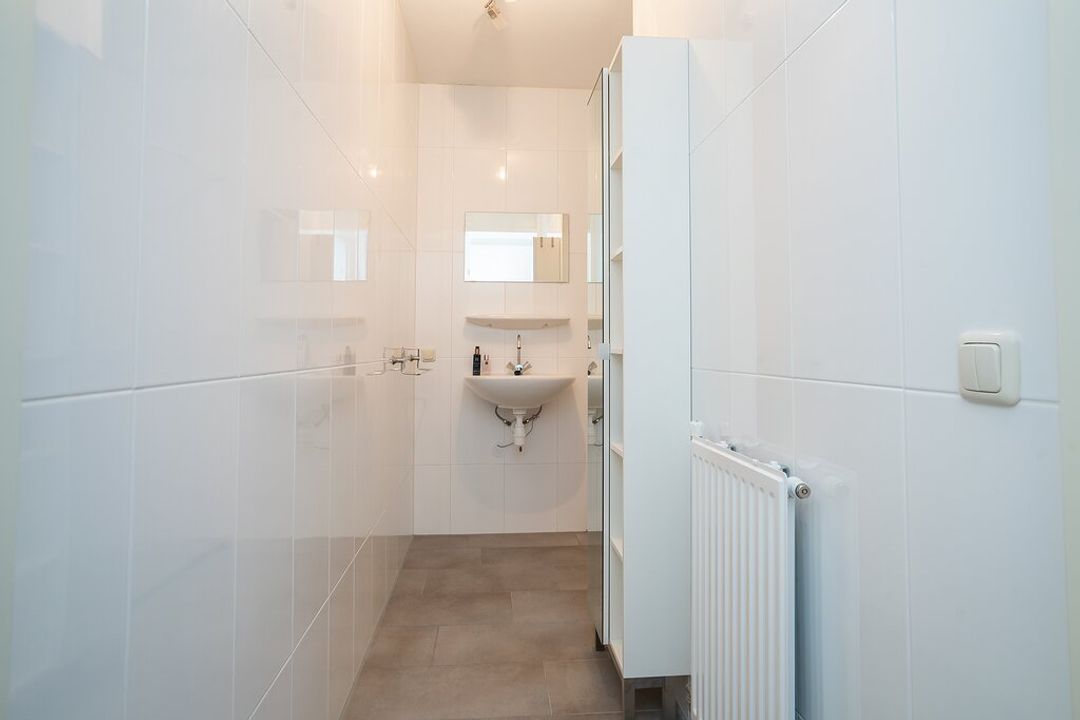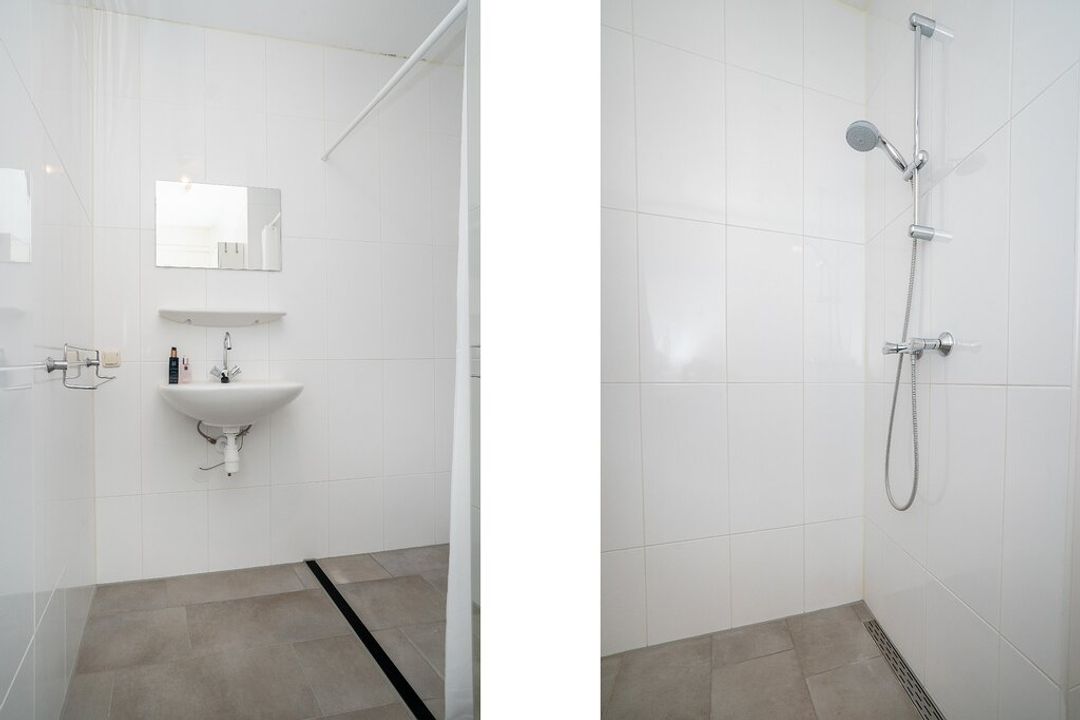 De badkamer is geheel betegeld in geheel de zelfde style als de separate toiletruimte. Daarnaast heeft het een zeer ruime inloopdouche met drain, een wastafel en een mechanisch ventilatiesysteem.