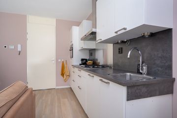 De keuken is afgewerkt met witte panelen aan de opbergkasten. Daarnaast heeft het een stijlvolle antracietkleurig werkblad met RVS spoelbak. De style van het werkblad loopt feilloos door als achterwand van de keuken en wordt onderbroken door de RVS spatwand bij het 5-pits gasfornuis. De spatwand loopt tevens door naar de RVS afzuigkap. De keuken is voorzien van verschillende inbouwapparatuur zoals; een vaatwasser, koelkast en een combioven.