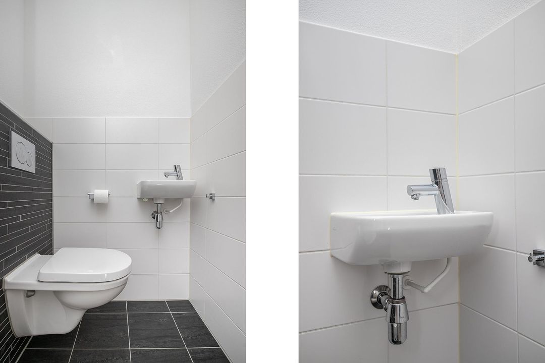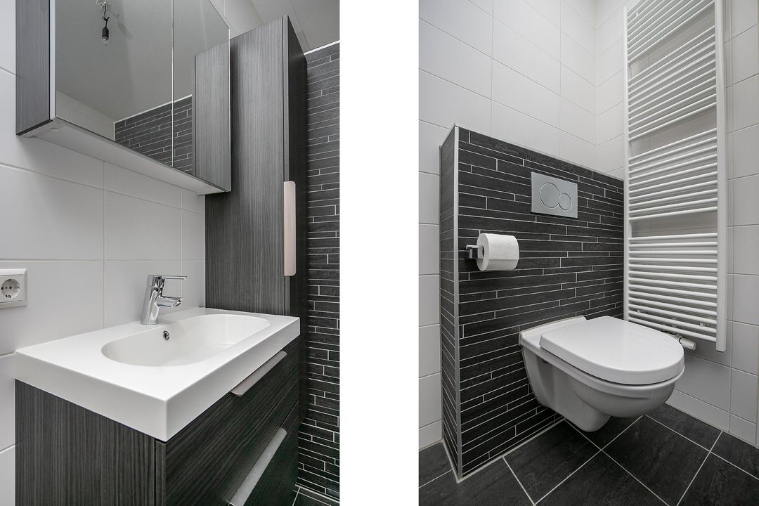 De toiletruimte is half betegeld met antracietkleurige vloertegels en heeft siertegels op de achterwand van het hangende toilet. De wanden zijn half betegeld met witte wandtegels en strak schilderwerk naar het plafond. Naast het hangende toilet is er ook een wit fonteintje aanwezig.