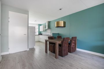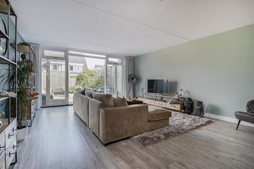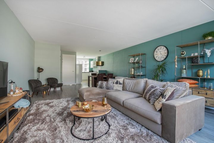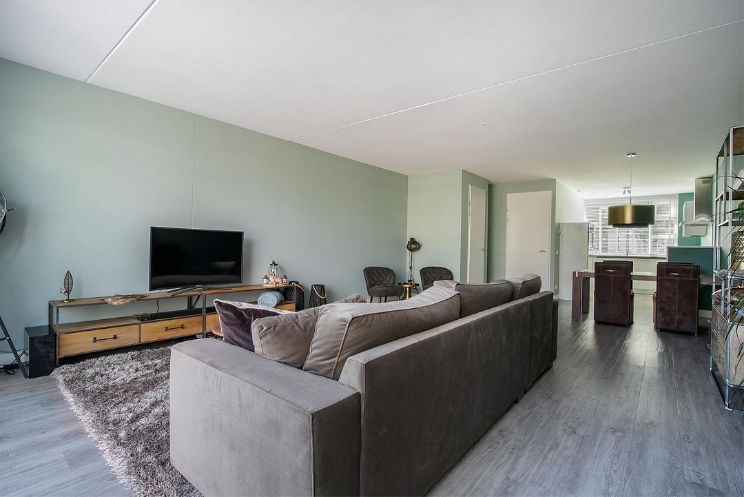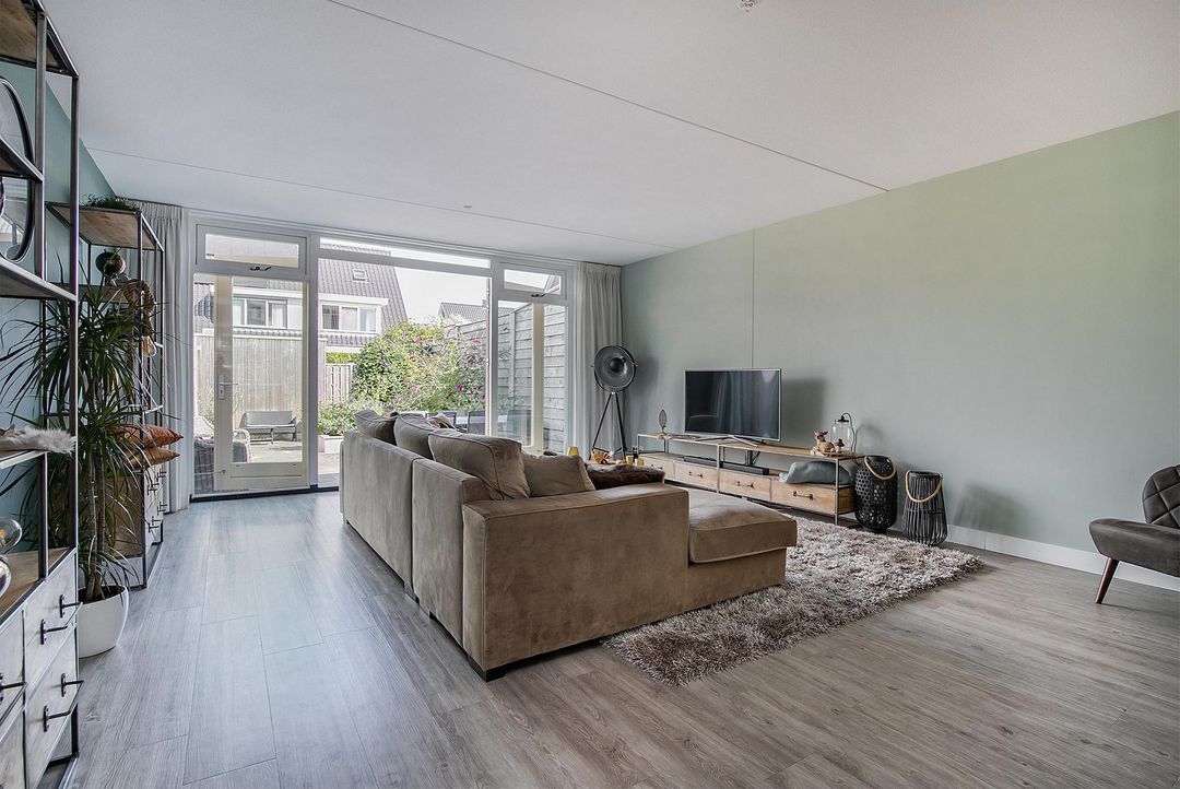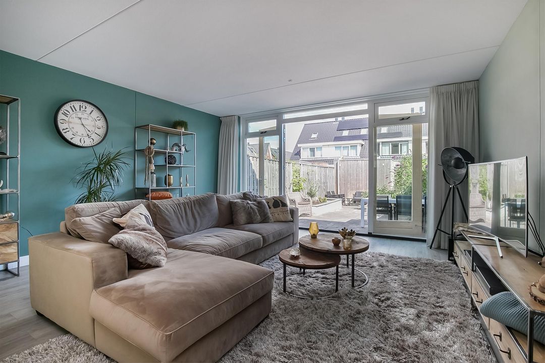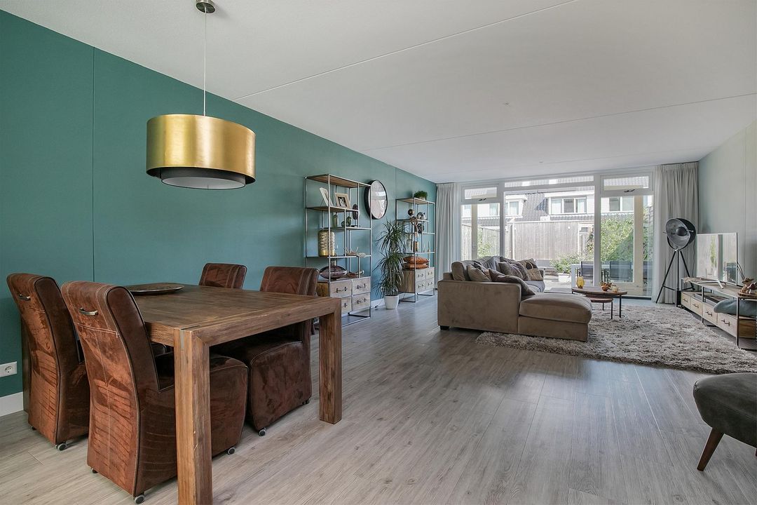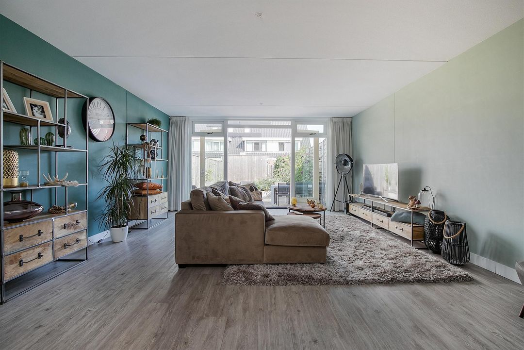 Vanuit de ontvangsthal loopt u deze prachtige en zeer royale woonkamer binnen. Doordat de begane grond maar liefst 12,5 meter lang is, is de ruimte zeer ruim van opzet. De twee grote openslaande tuindeuren, in combinatie met de grote glazen pui naar de achtertuin zorgen ervoor dat er een bijzonder prettige lichtinval in de woonkamer aanwezig is. Daarnaast heeft de woonkamer een ruime trapkast voor extra bergruimte en heeft u doorloop naar de open keuken aan de voorzijde van de woning. Het plafond is afgewerkt met strak wit schilderwerk, waar er aan de wanden is gekozen voor een lichtgroene en een donkergroene afwerking.