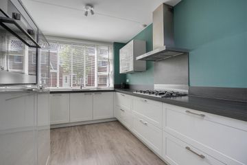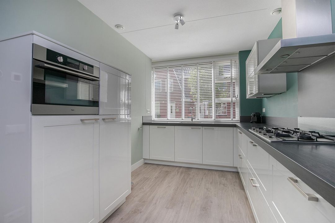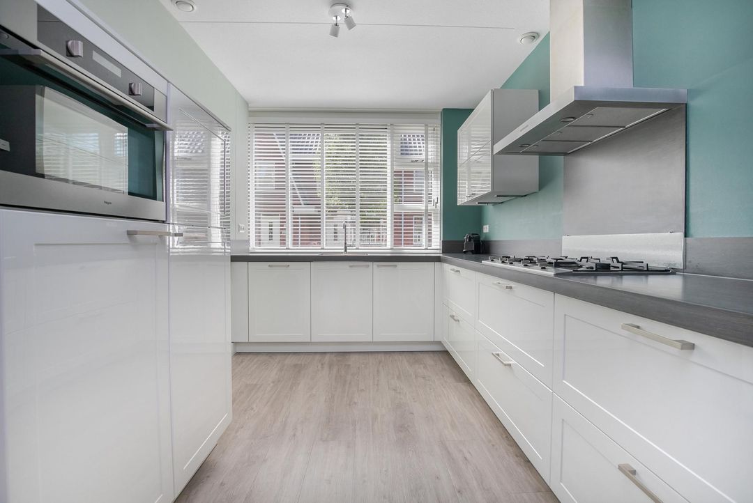 De open keuken is het verlengstuk van de woonkamer. Deze prachtige keuken heeft een moderne uitstraling en ontzettend veel werk- en opbergruimte! Het keukenblok met een L-opstelling heeft tevens een extra kasten opstelling parallel aan het kookgedeelte. De keuken heeft antracietkleurig kunststof werkblad waarin de rvs-spoelbak en het 5-pits gasfornuis netjes in zijn afgewerkt. De vele opbergkasten zijn voorzien van witte hoogglans panelen. Daarnaast heeft de keuken diverse inbouwapparatuur zoals: een combioven, vaatwasser, koelkast, diepvries en heeft een extra brede afzuigkap boven het gasfornuis hangen. De keuken is gelegen aan de voorzijde van de woning en heeft dan ook een zeer prettige lichtinval door de grote raampartijen in de voorgevel.