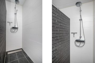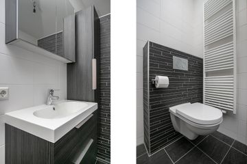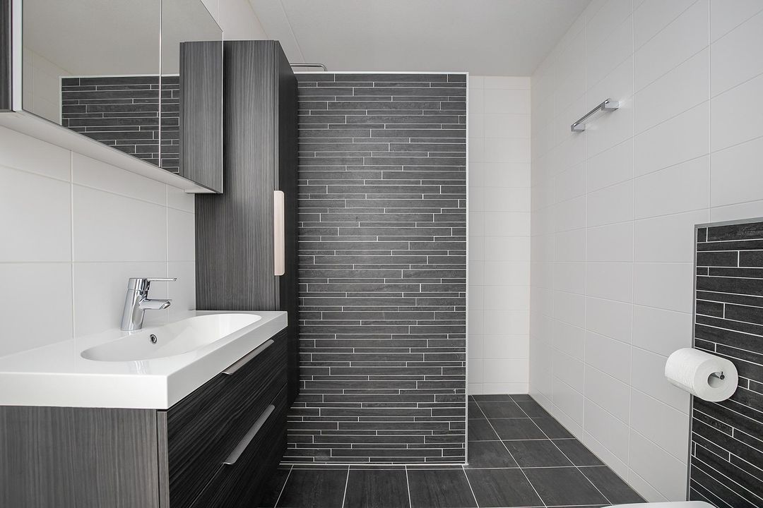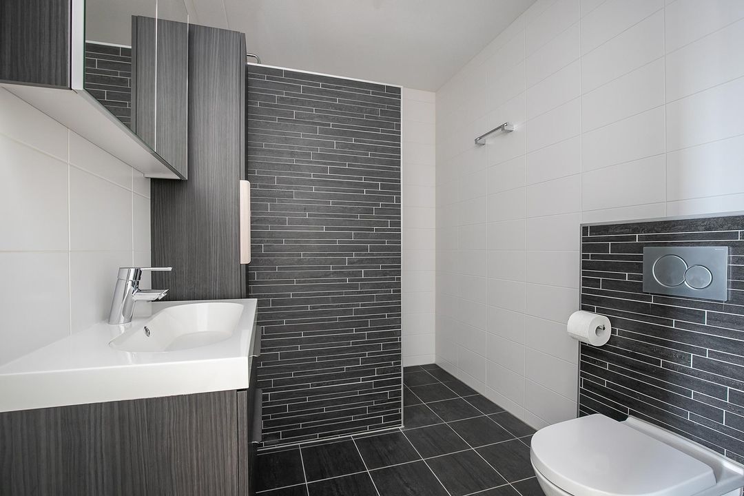 De badkamer is een strakke, moderne ruimte. Deze ruimte is volledig betegeld met een antracietkleurige vloertegel. Aan de wanden is er gekozen voor witte wandtegels in combinatie met antracietkleurige siertegels op de tussenwand van de inloopdouche en de achterwand van het toilet. De badkamer is voorzien van een inloopdouche met regen- en handdouche, een hangend toilet, een wastafel met designmeubel(s) en een mechanisch ventilatiesysteem.