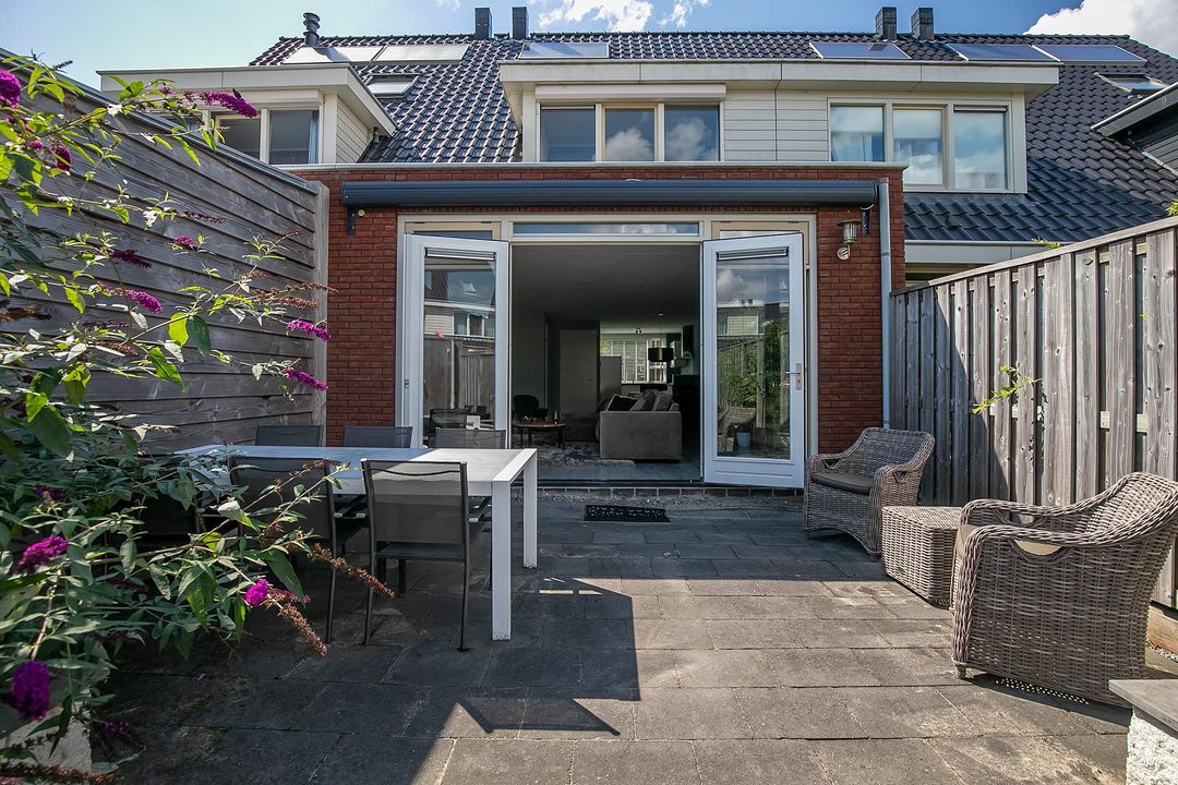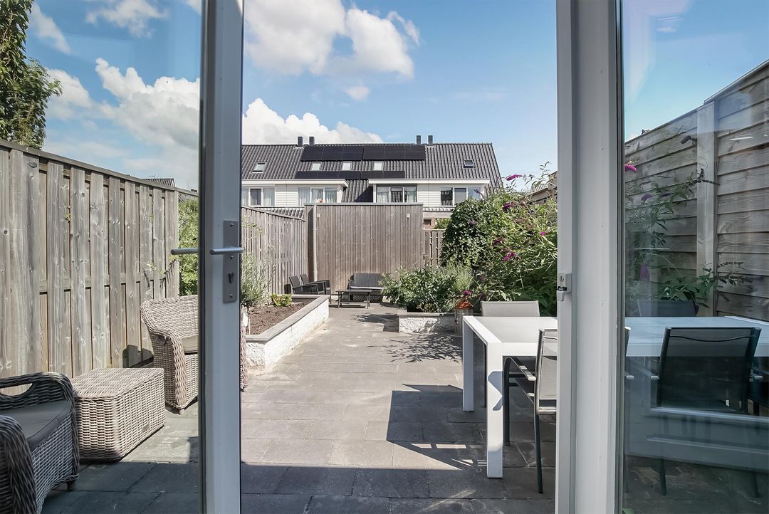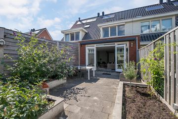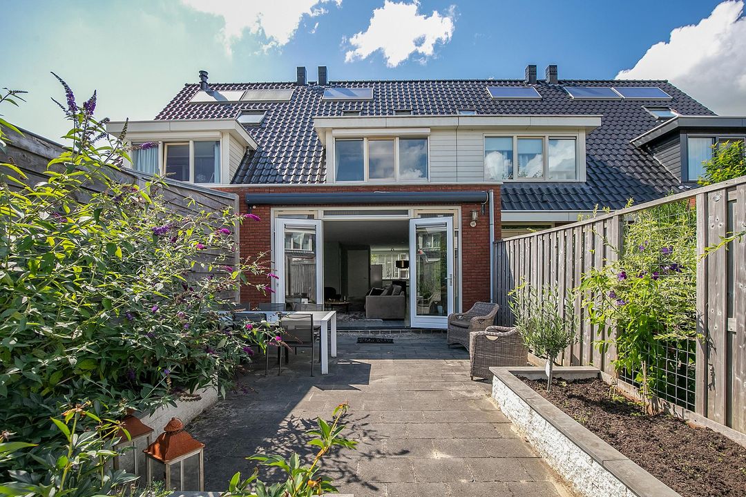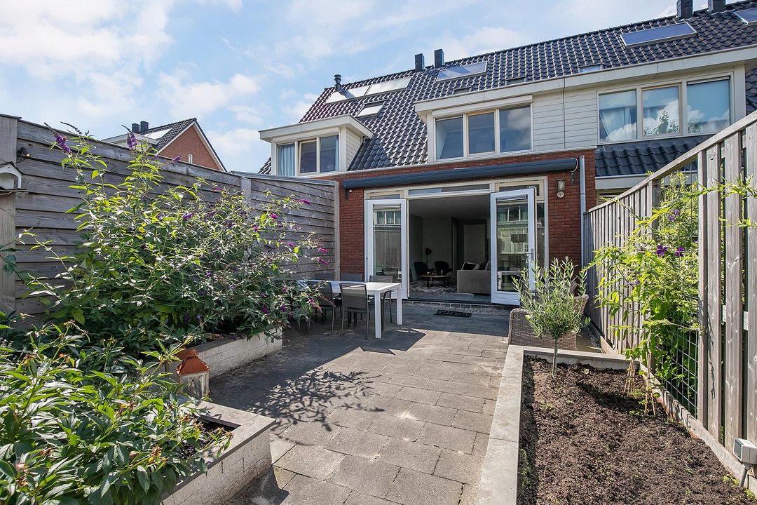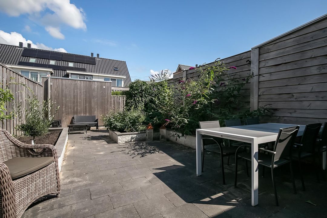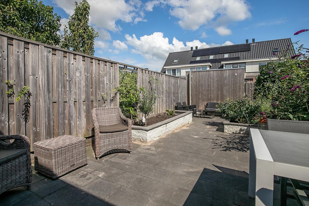 Vanuit de openslaande deuren van de woonkamer loopt u zo deze heerlijke tuin(66m2) op het oosten in. De tuin is grotendeels bestraat in combinatie met een aantal van steen opgebouwde plantenborders. Ook treft u hier de houten berging (6 m2) welke is voorzien van elektra en is de tuin ook te bereiken via de achterom.