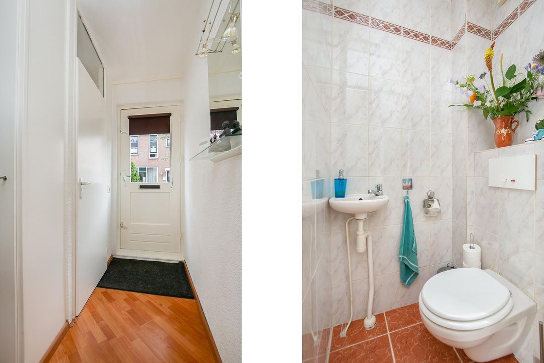 De toiletruimte is volledig betegeld. Zo is de vloer afgewerkt met een donker oranjekleurige vloertegel en is er aan de wand gekozen voor licht gemarmerde wandtegels. Tevens heeft de wand een sierlijst met dezelfde kleurstelling als de vloertegels. Daarnaast is er een hangend toilet en een fonteintje aanwezig.