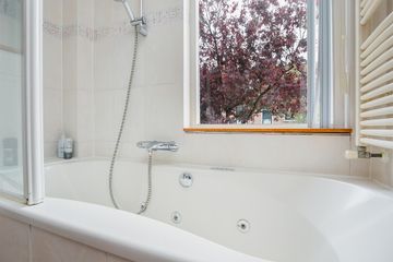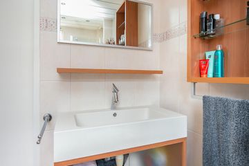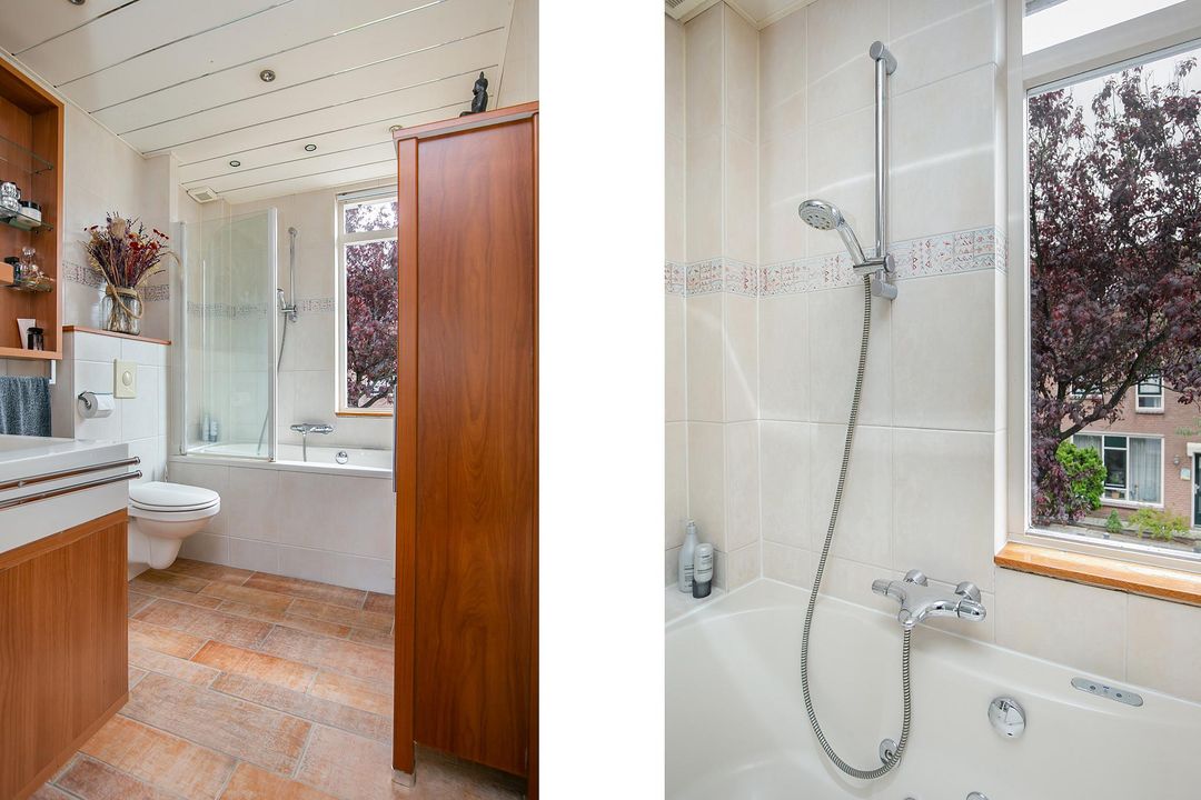 De badkamer heeft een warme uitstraling door de lichte betegeling op de wanden en op de vloer. De ruimte heeft een groot raam met een bovenlicht waardoor u niet alleen een prettige lichtinval heeft, maar ook nog eens snel en eenvoudig kunt ventileren. Daarnaast is er een hangend toilet aanwezig, een whirlpool met douche, een designradiator, mechanisch ventilatiesysteem een wastafel en een praktische designradiator.
