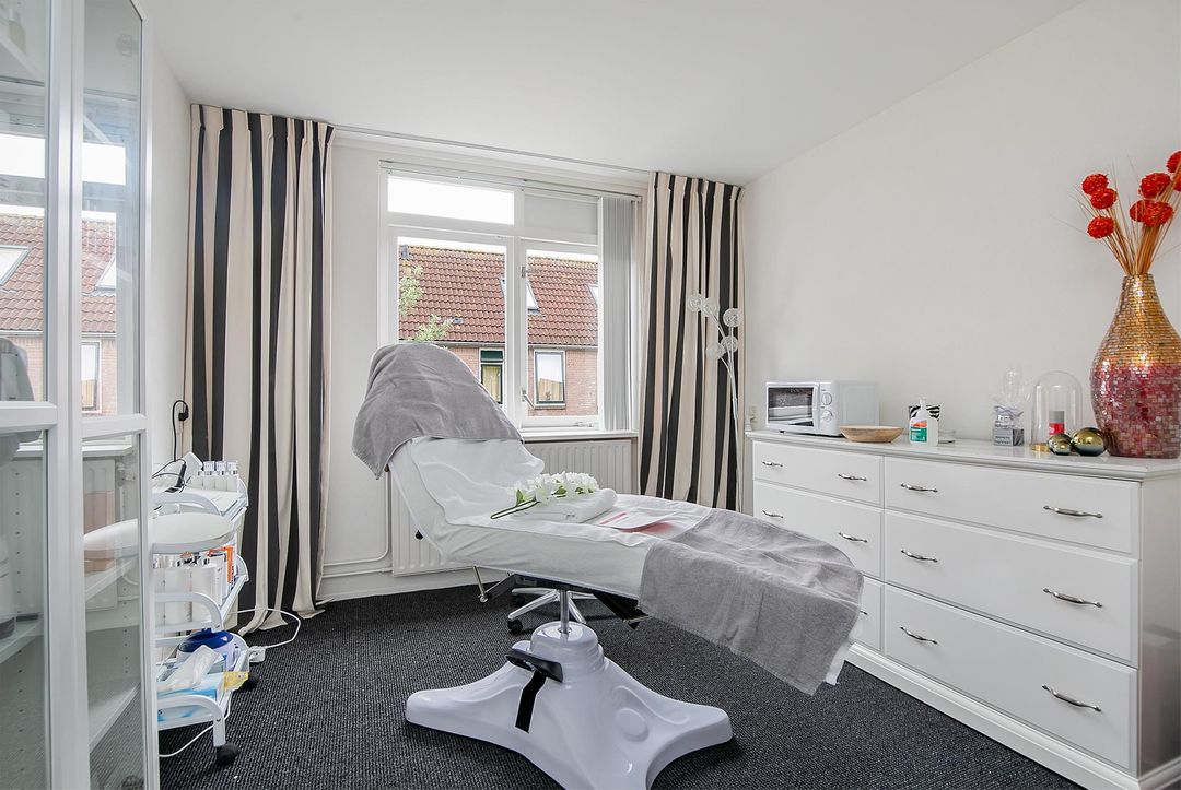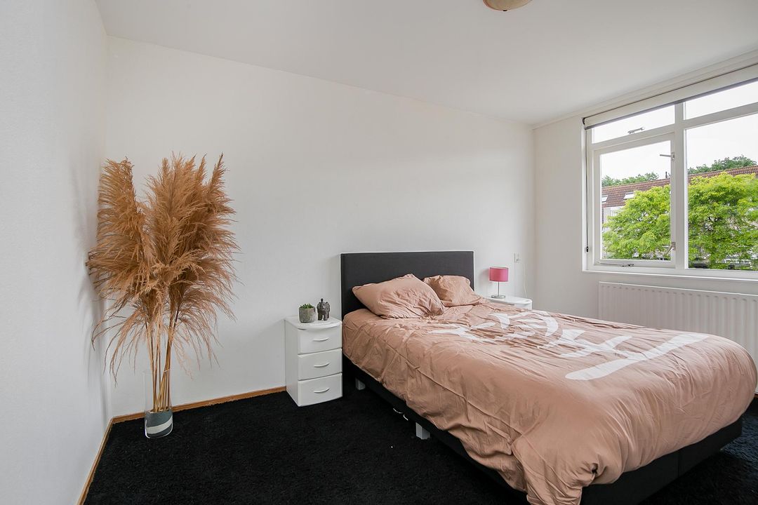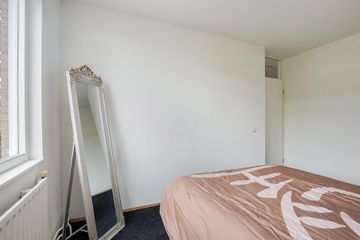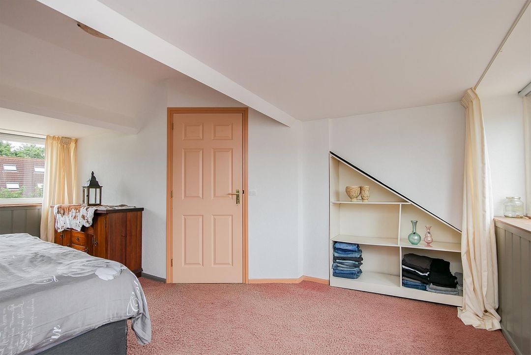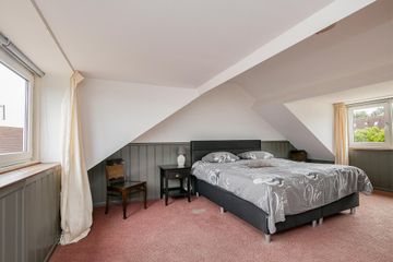 De slaapkamer is zeer royaal doordat er aan weerszijde kunststof dakkapellen aanwezig zijn met diverse draaikiepramen. Daarnaast is er een fraaie lambrisering aanwezig welke doorloopt over de knieschotten met extra bergruimte. De kamer is afgewerkt met een lichtroze tapijtvloer en strak wit schilderwerk aan de wanden en het plafond.