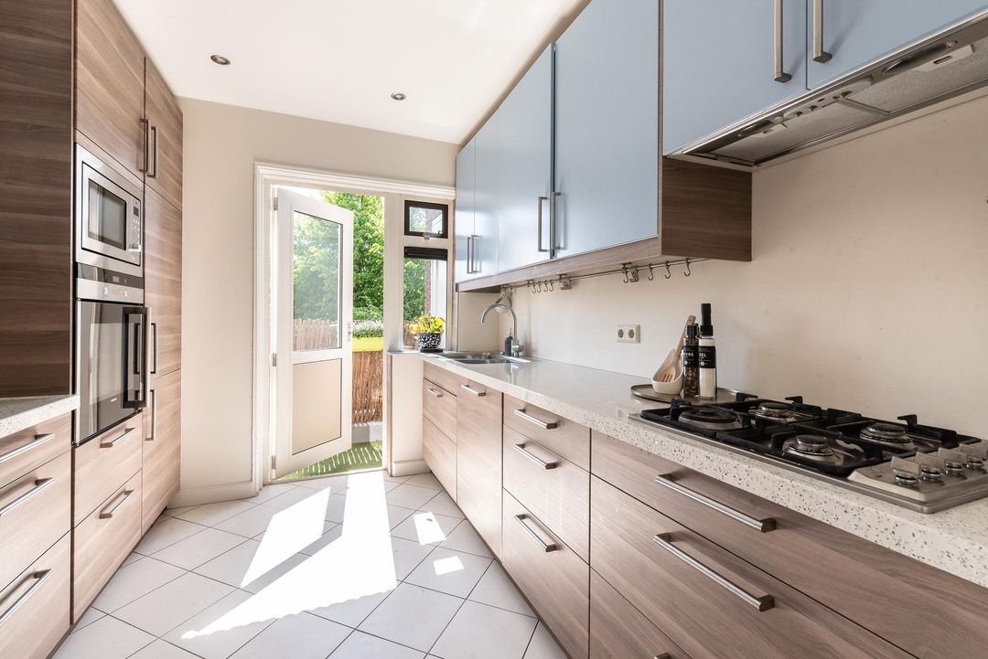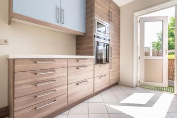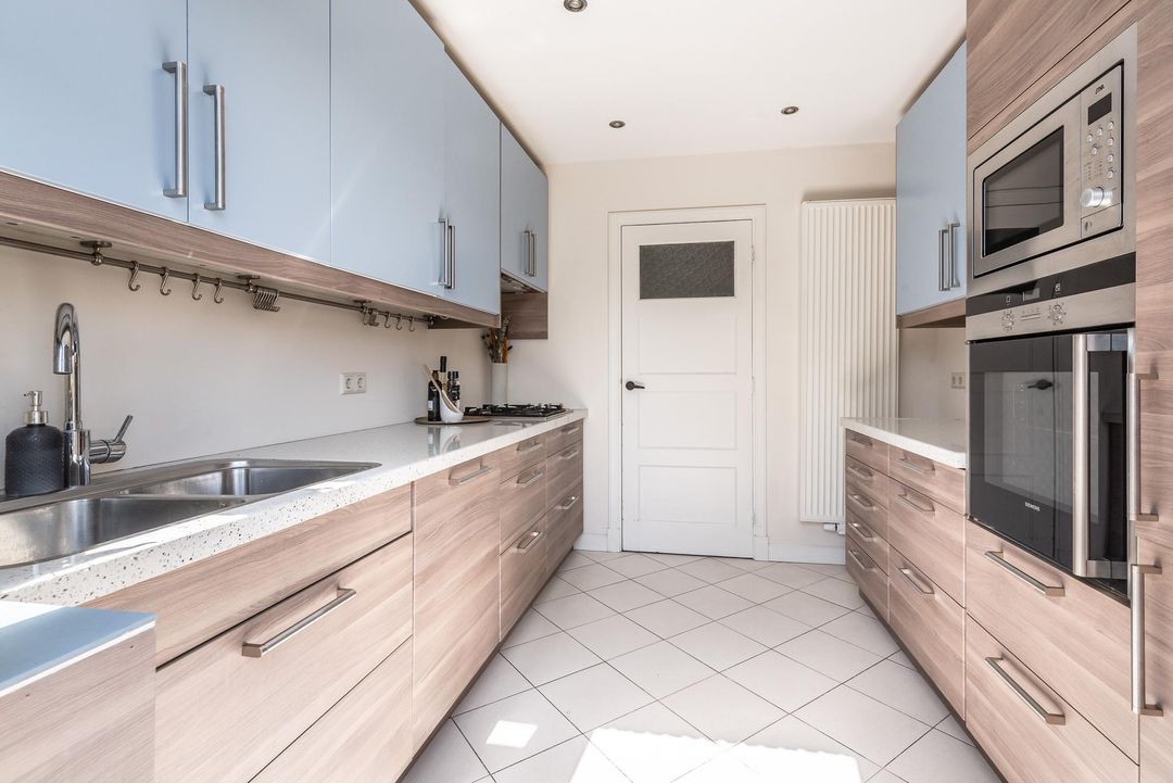 Aan werk en opbergruimte heeft u in deze nette keuken geen gebrek! Deze ruime keuken heeft een rechte opstelling aan weerszijden. Het lichtkleurige werkblad is van composiet en heeft naast een dubbele rvs-wasbak een 4 pits gasfornuis. De vele opbergkasten zijn voorzien van zowel houtlook als lichtblauwe panelen en zijn voorzien van diverse inbouw apparatuur. Zo is er een vaatwasser, oven, magnetron, koelkast én een vriezer aanwezig. De afgesloten keuken is afgewerkt met strak stukwerk aan de wanden en ook het plafond is strak gestukt. Daarnaast heeft het plafond verschillende inbouwspots en wordt de ruimte prachtig belicht door de aanwezige raampartijen en de loopdeur die toegang geeft tot het balkon. Op het balkon zijn er nog twee opbergkasten.