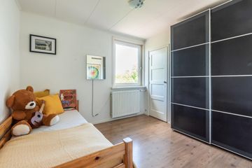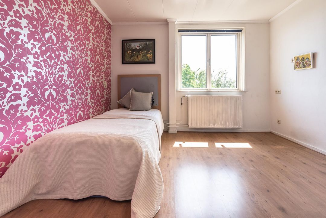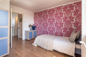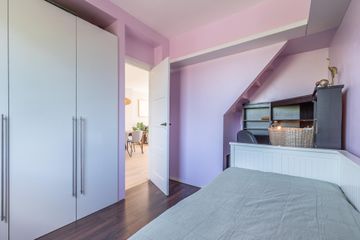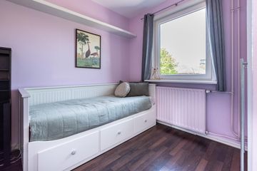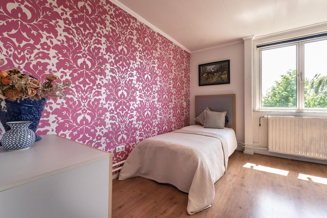 De derde slaapkamer heeft een lichte afwerking van zowel witte muren als roze/wit behang. Daarnaast heeft deze kamer 2 openslaande ramen waardoor de ruimte zeer goed wordt belicht. De vierde slaapkamer is afgewerkt met witgeschilderd vliesbehang en heeft een handige inbouwkast voor extra bergruimte.
