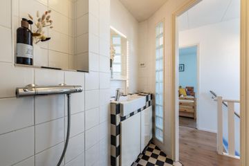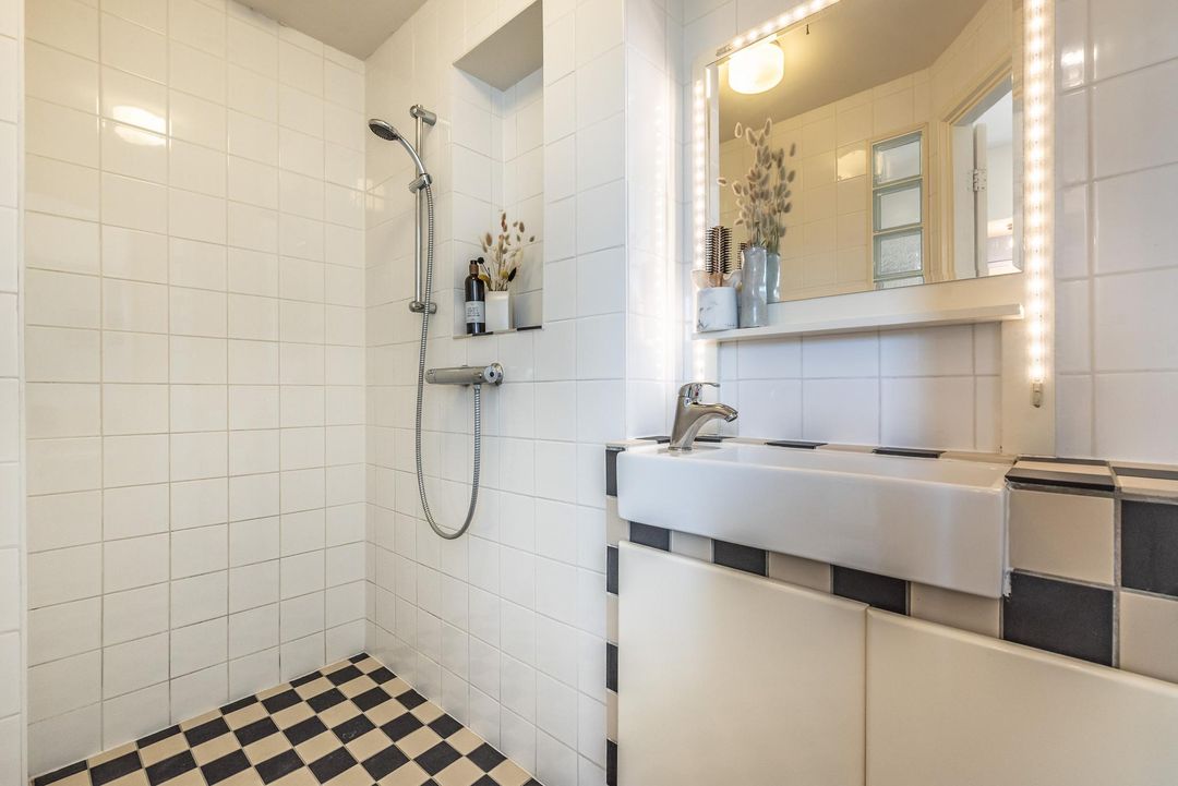 De zeer nette en goed onderhouden badkamer is volledig betegeld. Waar er aan de wanden is gekozen voor een witte wandtegel, heeft de vloer een combinatie van zwarte en witte tegels. Deze komen tevens terug in de koof bij de douche en in de ombouw van het badkamermeubel met spoelbak. Er is een ruime inloopdouche aanwezig en u kunt de ruimte eenvoudig ventileren middels het mechanische ventilatiesysteem.
