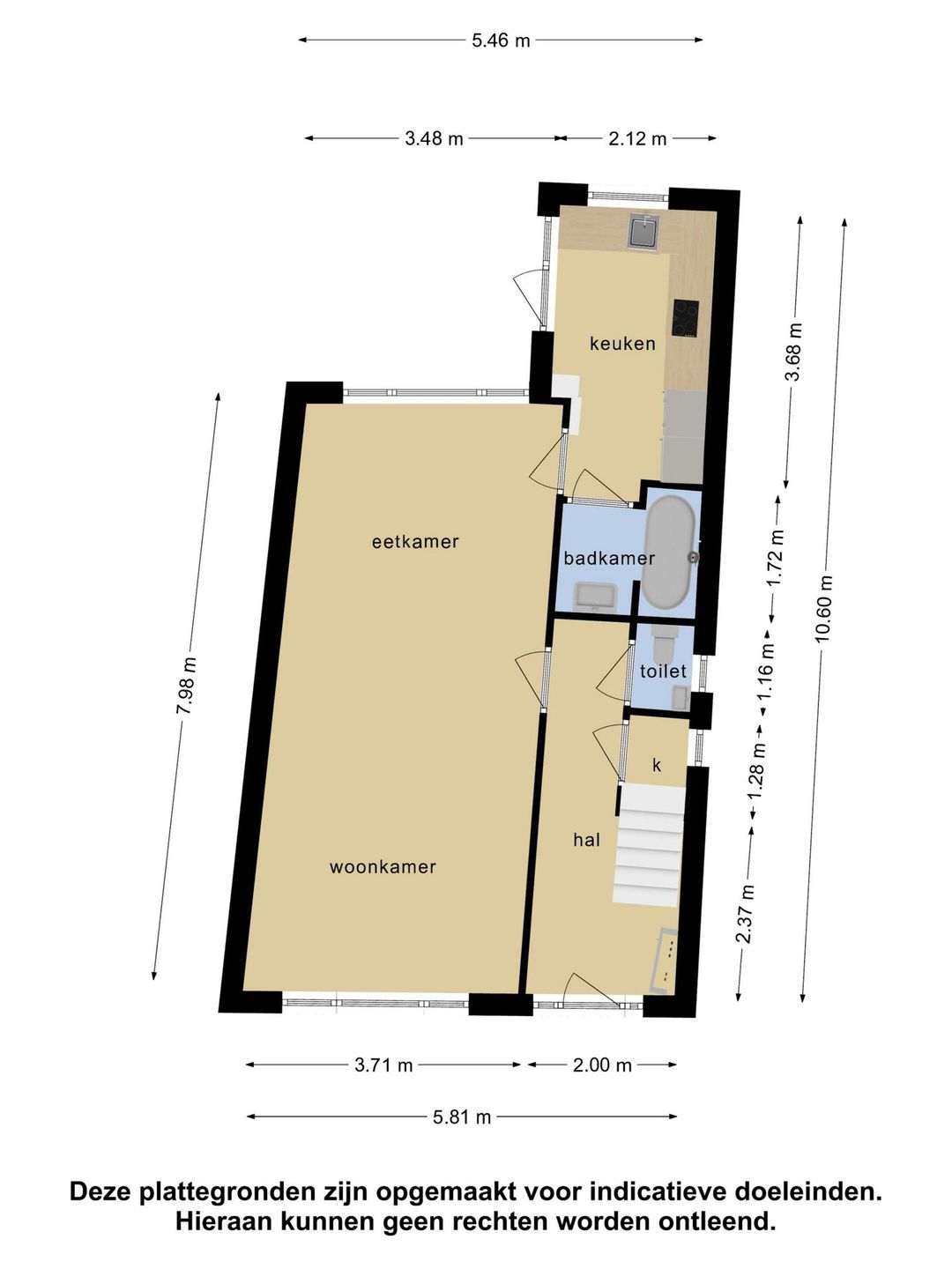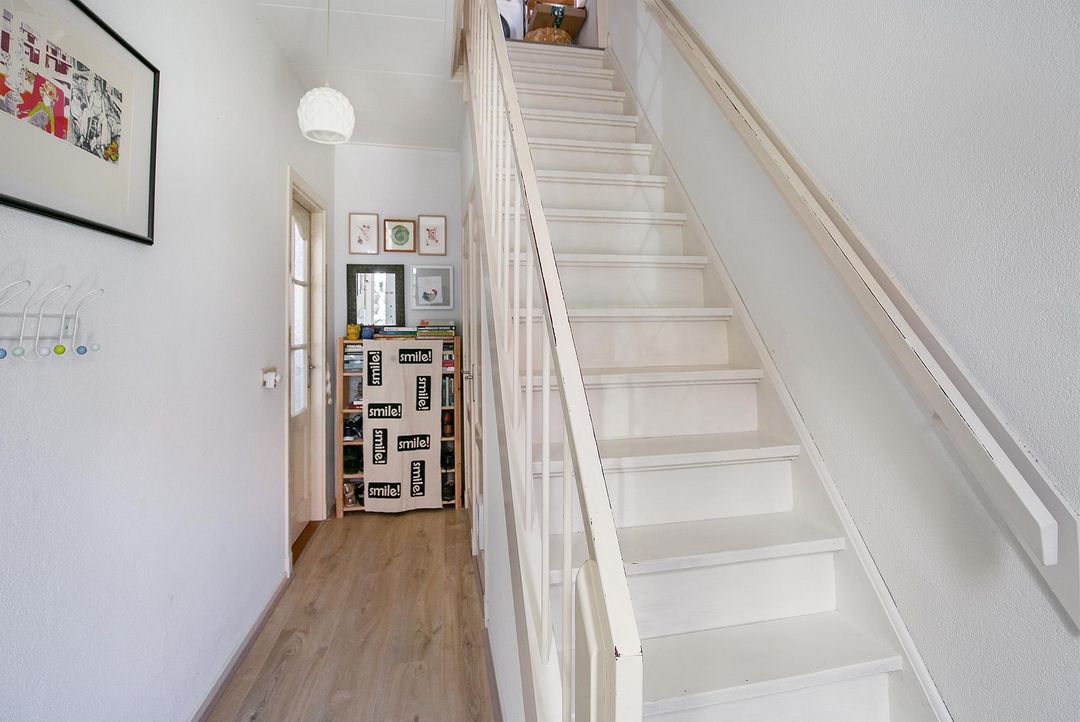 Middels de voordeur betreedt u de ontvangsthal met toegang tot de meterkast, het toilet, de woonkamer en de vaste trap (met trapkast) naar de 1e verdieping. Zowel de wanden als het plafond hebben een witte afwerking en op de vloer is er gekozen voor een lichte laminaatvloer.