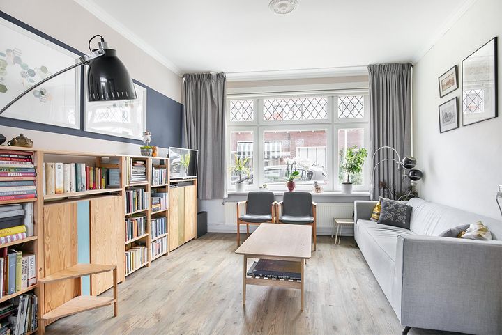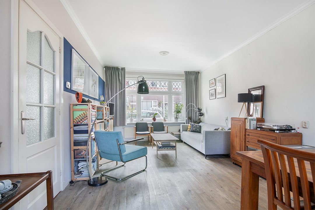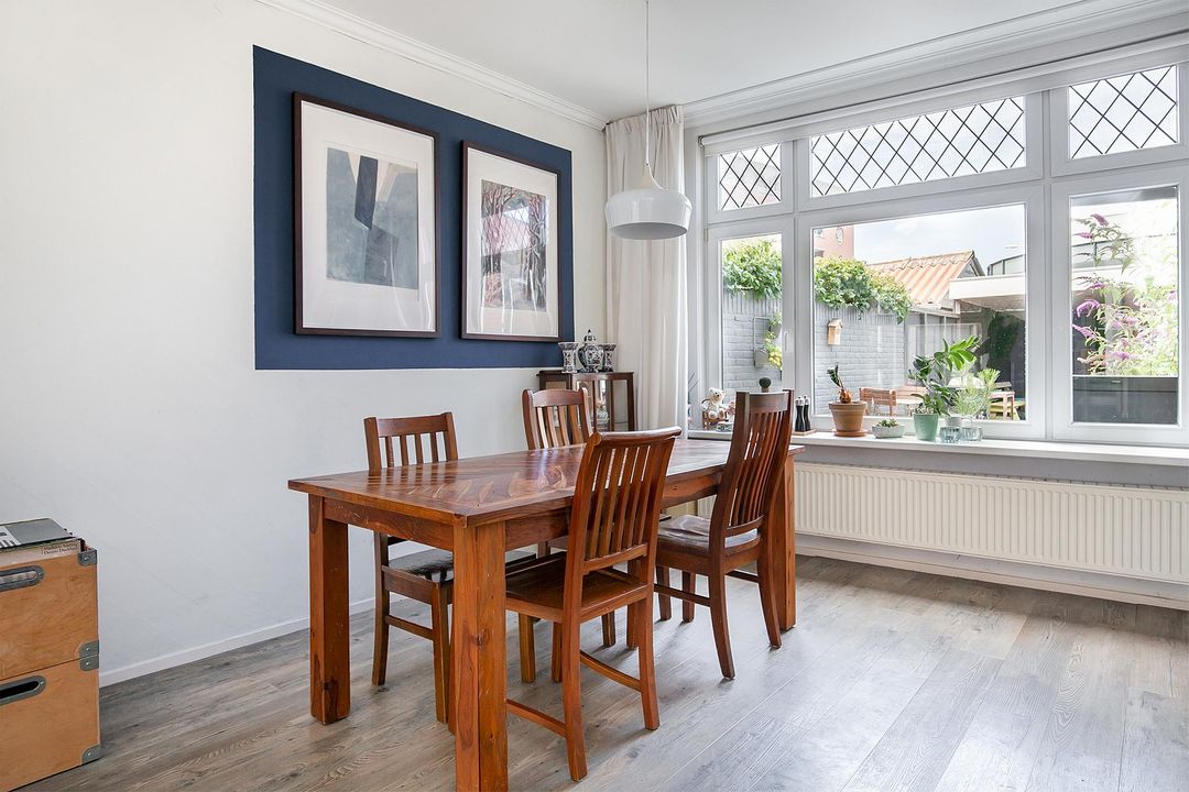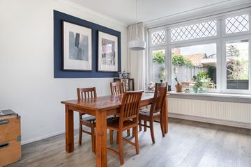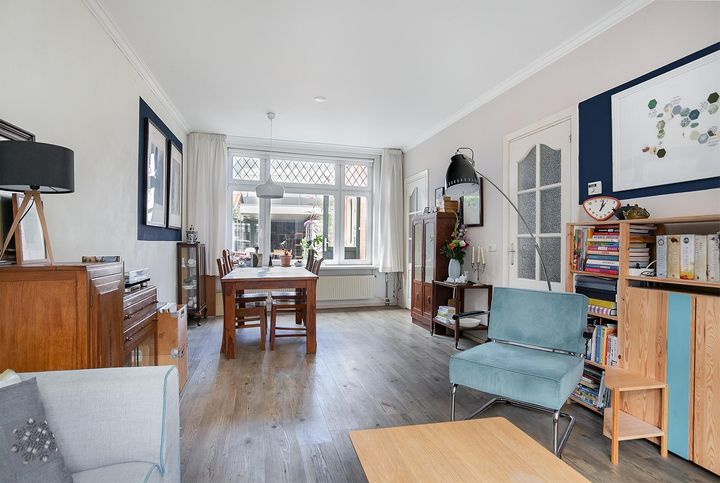 De woonkamer is een zeer prettige leefruimte die uitstekend wordt belicht met de grote raampartijen aan weerszijden van de woning! De fraaie glas-in-lood details in het bovenraam staan perfect in lijn met de karakteristiek van deze woning. Door de ruime opzet heeft u meer dan voldoende plaats op een zit- en eetgedeelte te creëren. Er ligt een nette ‘houtlook’ pvc-vloer en aan de wanden is er gekozen voor licht behang. Daarnaast is het plafond strak gestuct en afgewerkt met sierlijsten.