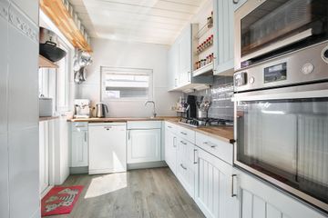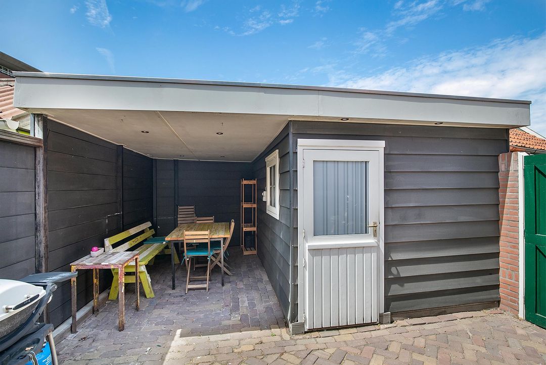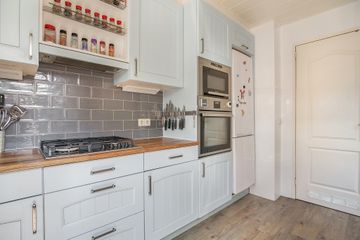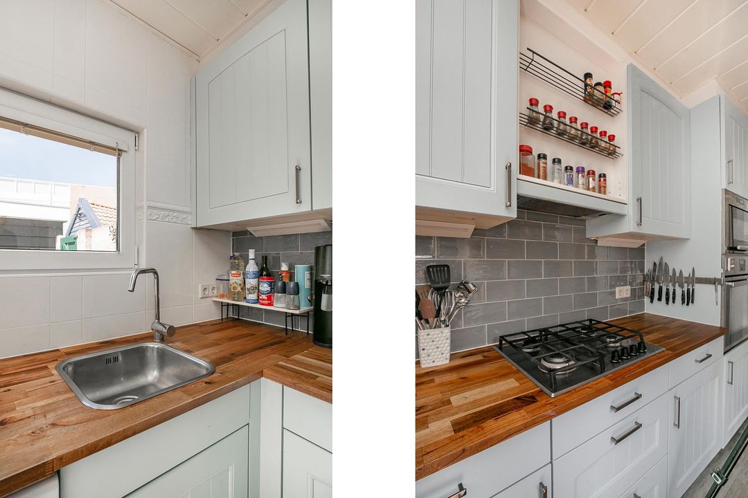 De keuken betreedt u via de woonkamer en geeft toegang tot de badkamer en de tuin. De keuken heeft een royale L-opstelling, aan werk- en opbergruimte dus geen gebrek! Het houten werkblad heeft rvs-spoelbak en een 4-pits gasfornuis. De vele opbergkasten zijn voorzien van lichtblauwe panelen en verschillende inbouwapparatuur. Zo is er een magnetron en een oven aanwezig en heeft de keuken een Miele vaatwasser en een losse koel/vriescombinatie. Er prettig is ook het daglicht wat binnenkomt door de vele aanwezige raampartijen.
