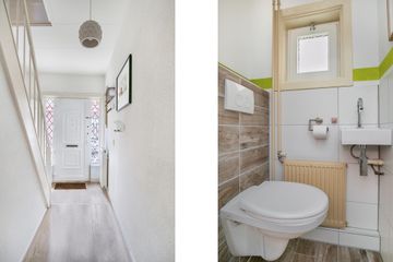 De toiletruimte is half betegeld met een combinatie van witte en ‘houtlook’ tegels. Er is een fonteintje aanwezig, een hangend toilet en een openslaand raampje die de ruimte van daglicht voorziet.