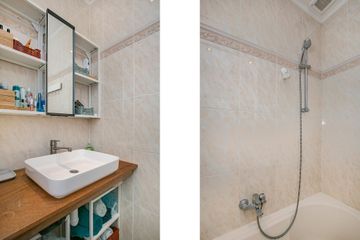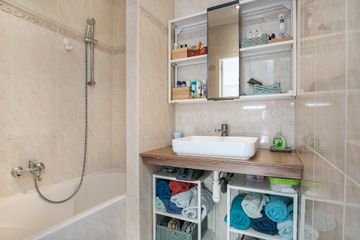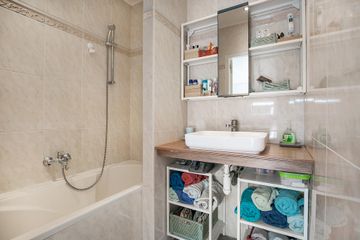 Via de keuken heeft u toegang tot de badkamer. Deze ruimte is volledig betegeld met een licht gemarmerde vloer- en wandtegel en heeft een sierlijst aan de wanden. Er is een badkamermeubel met wastafel aanwezig, een ligbad met handdouche en een designradiator.