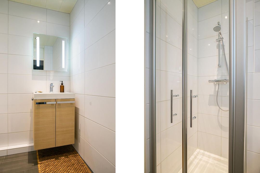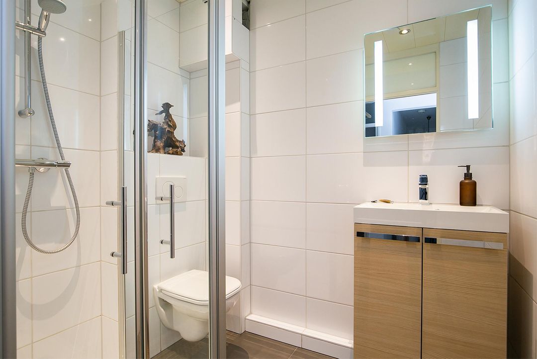 Deze ruimte is volledig betegeld met een witte wandtegel en heeft een grijze vloertegel. De badkamer is een nette ruimte met een inloopdouche, een wastafel met meubel en een hangend toilet waarvan de spoelbak netjes is weggewerkt in de wand.
