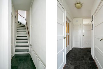Middels de centrale entree met de brievenbus en het bellentableau heeft u toegang tot het trappenhuis. De ontvangsthal op de 1e verdieping geeft toegang tot de maisonnette woning.