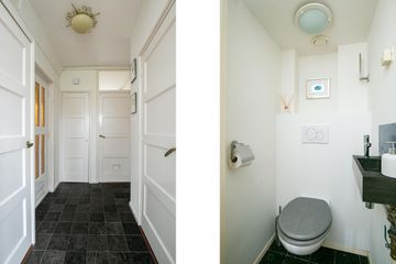 Middels de voordeur betreedt u de ontvangsthal met toegang tot de meterkast, bijkeuken, keuken, toiletruimte, ruime bergkast, de trap naar de eerste verdieping en de woonkamer. Vanuit hier is de natuurstenen tegelvloer (Belgisch blauwsteen) doorgelegd over de gehele verdieping m.u.v. de woonkamer. Zowel de wanden als het plafond zijn afgewerkt met strak wit schilderwerk. De toiletruimte heeft een hangend toilet waarvan de spoelbak netjes is weggewerkt in de strakke witte wand. Tevens is er een fonteintje aanwezig en kunt u de ruimte ventileren middels het mechanische ventilatiesysteem.