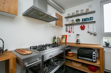 De keuken is een afgesloten ruimte te betreden middels de ontvangsthal. De ruimte wordt perfect belucht door de grote raampartij met een openslaand raam en is ruim genoeg om ook een grote eettafel neer te zetten. Er is een wastafel geplaatst met houten opbergkasten en het heeft een luxe rvs 5-pits gasfornuis met onderstel. Boven het gasfornuis heeft u een rvs- afzuigkap. De trapkast biedt extra bergruimte en er is tevens voldoende ruimte voor een losse koel- en vriescombinatie en een combi-oven. Een goede optie is om de keuken en bijkeuken bij elkaar te betrekken en zo 1 grote woonkeuken te realiseren!