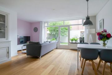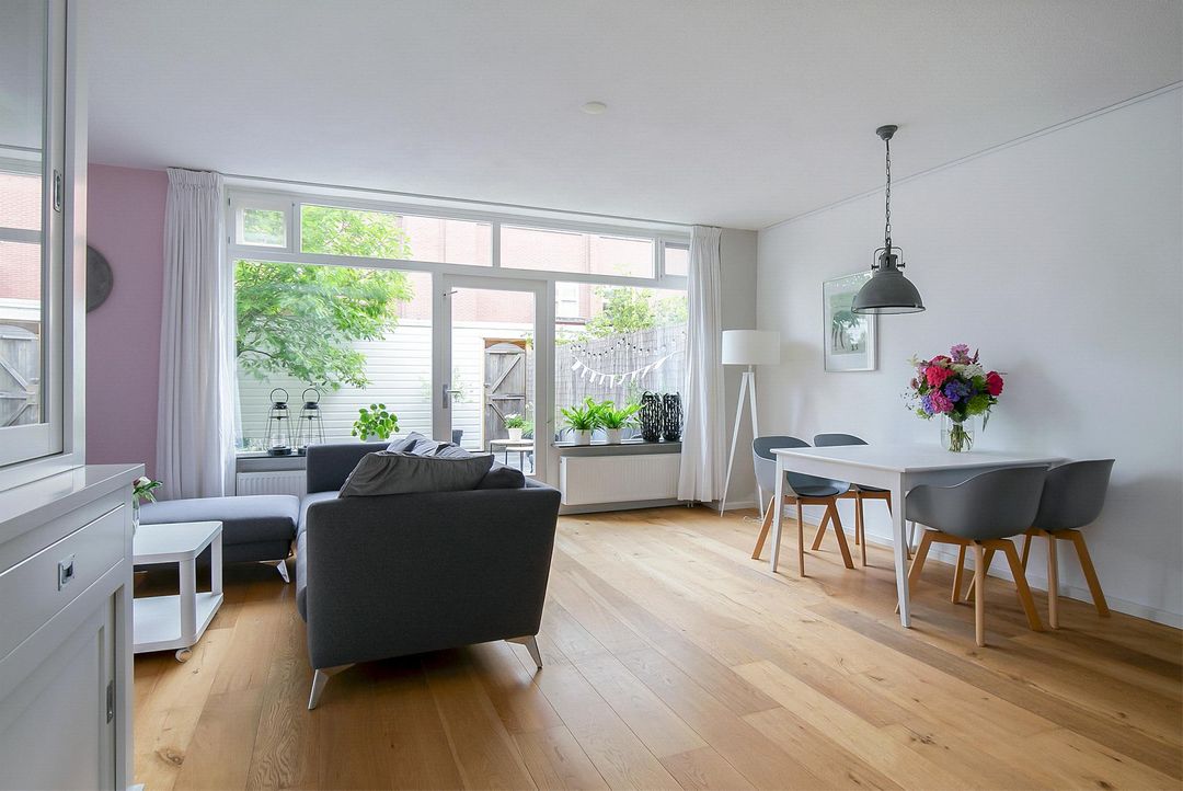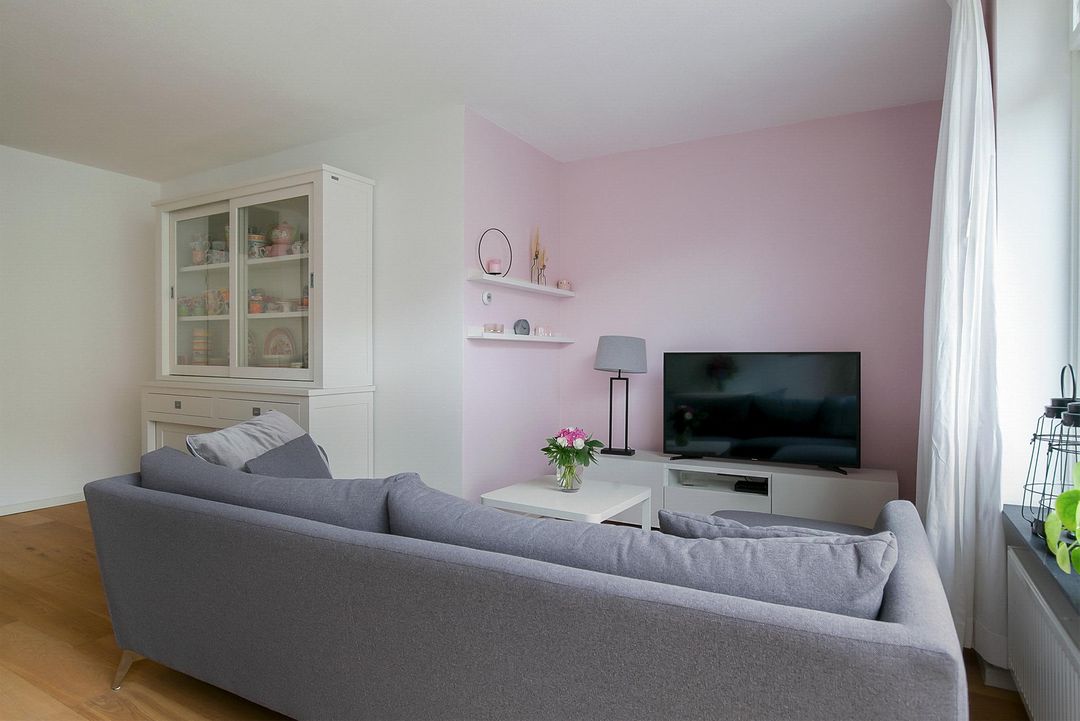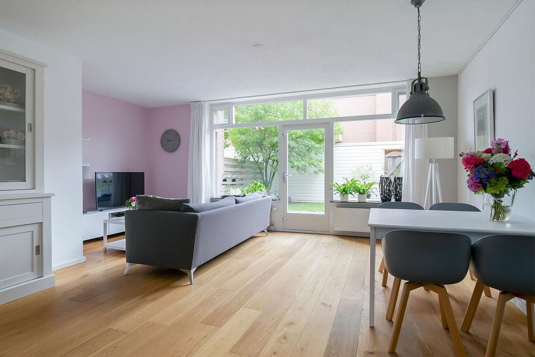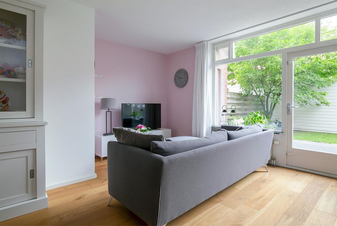 Een bijzonder prettige en verassend ruime leefruimte! De woonkamer is ruim van opzet en heeft daardoor ruim voldoende plaats voor een zithoek en een eethoek. Daarnaast is de ruimte zeer goed belicht door doordat de gevel aan de tuinzijde vrijwel geheel van glas is incl. een loopdeur naar de tuin. Daarnaast zijn de wanden en het plafond afgewerkt met strak wit schilderwerk in combinatie met een lichtroze wand bij de zithoek.