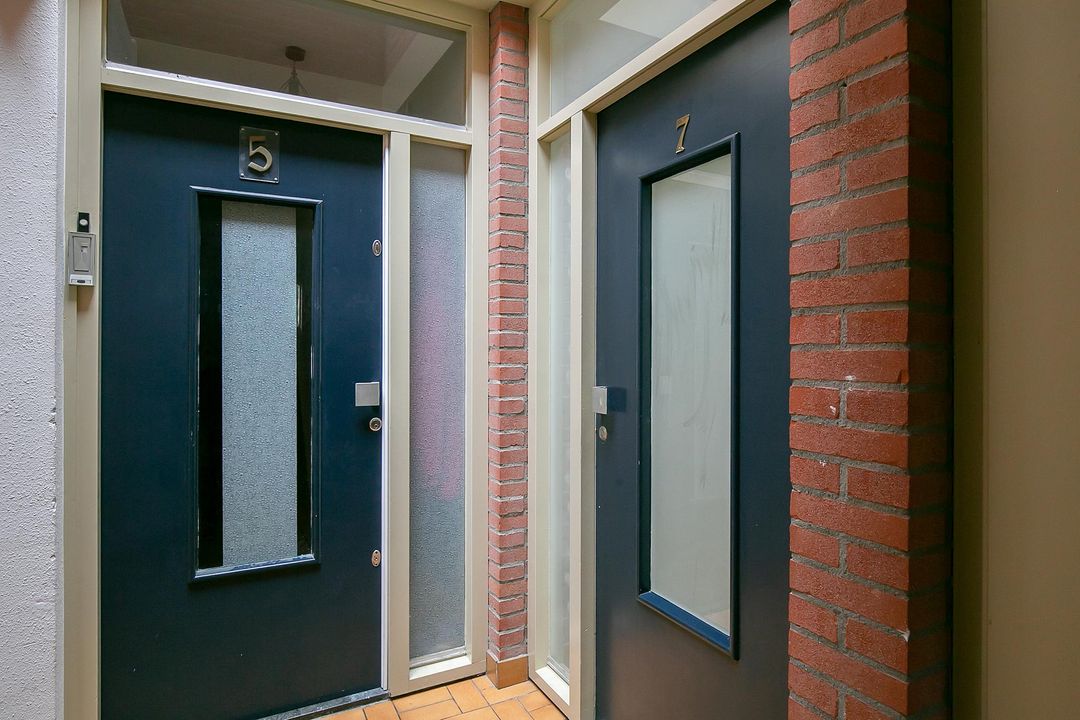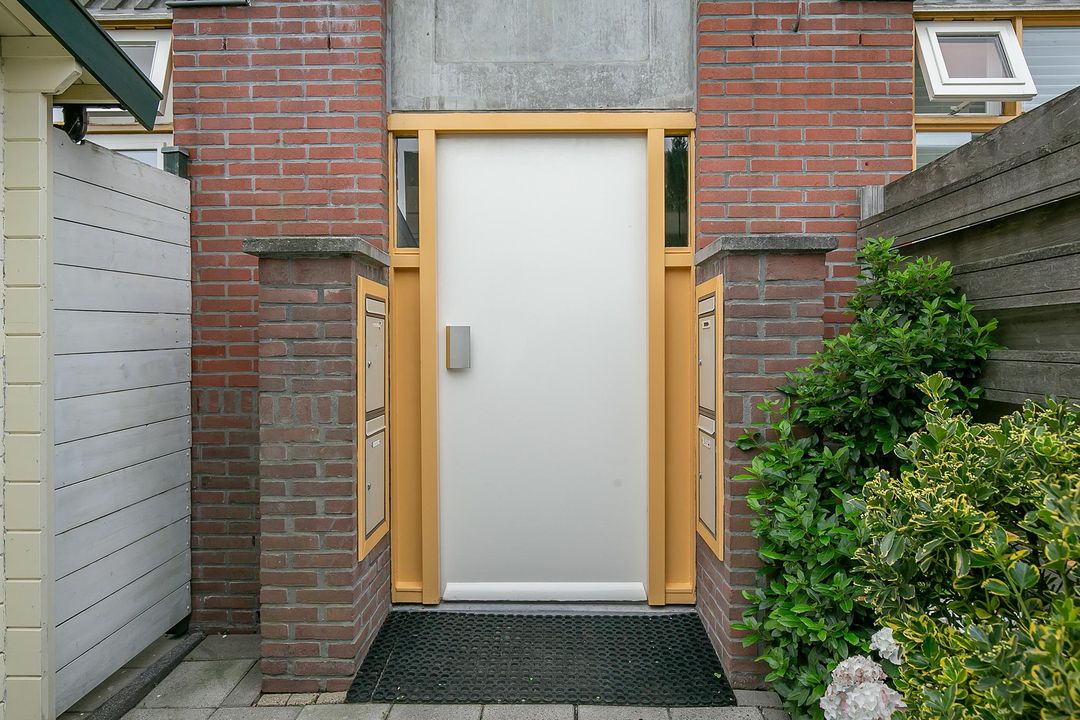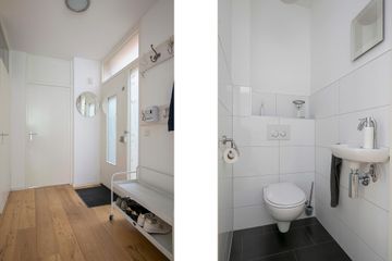 Middels de voordeur betreedt u de ontvangsthal met toegang tot de slaapkamer, het toilet, de badkamer en de woonkamer met open keuken. Vanuit hier is de houten vloer (lamelparket) doorgelegd naar de woonkamer. Zowel de wanden als het plafond zijn afgewerkt met strak wit schilderwerk. De toiletruimte is half betegeld met een witte wandtegel en heeft een antracietkleurige vloertegel. De ruimte heeft een hagend toilet, een fonteintje en een mechanisch ventilatiesysteem.