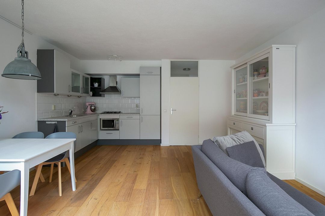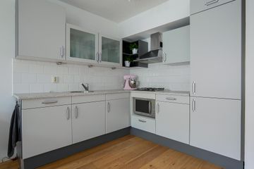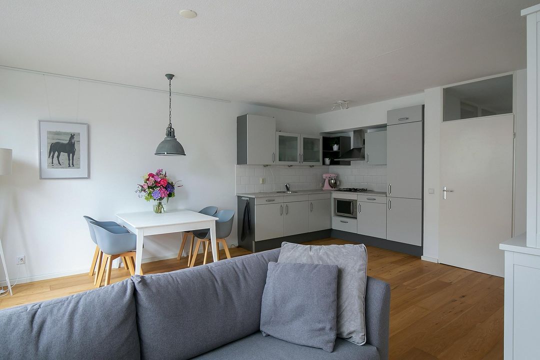 De openkeuken is het verlengstuk van de woonkamer. De keuken heeft een L-opstelling en heeft een kunststof werkblad waarin de rvs- spoelbak en het 4-pits gasfornuis netjes zijn afgewerkt. Daarnaast zijn de vele opbergkasten, met witte panelen, voorzien van diverse inbouwapparatuur; combi-oven, vriezer en koelkast. Tevens heeft keuken heeft een nette rvs-afzuigkap hangen boven het gasfornuis en een wit betegelde achterwand.
