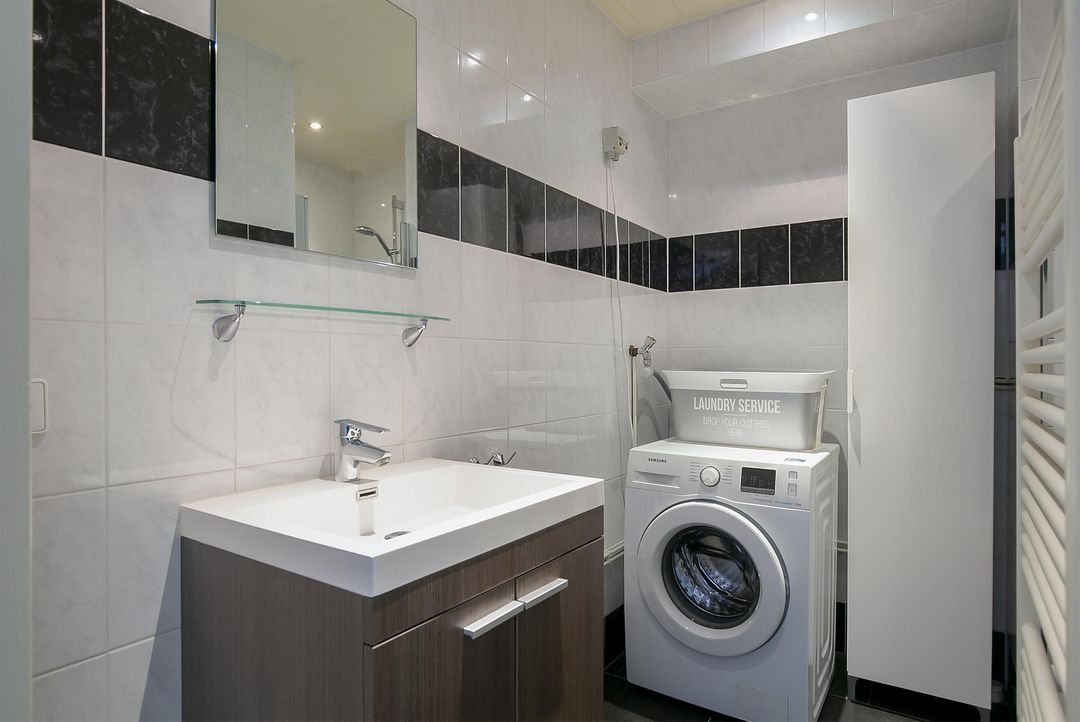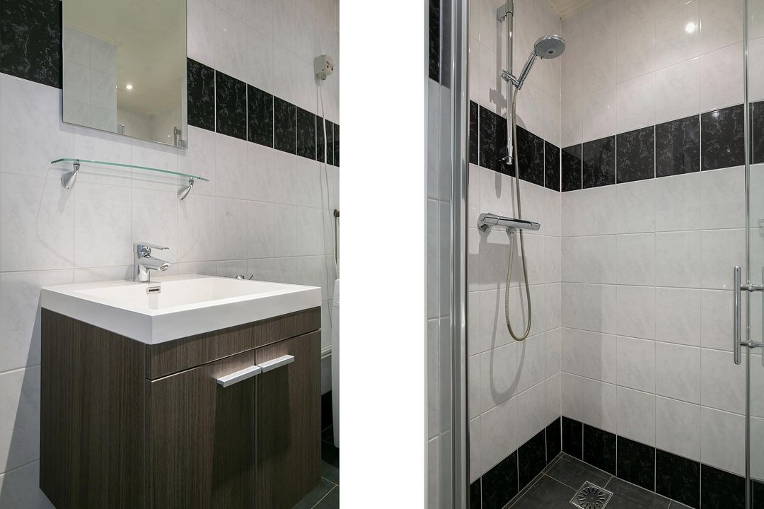 De badkamer is volledig betegeld met een wit gemarmerde wandtegel en een zwarte sierlijst. De vloer is betegeld met een antracietkleurige vloertegel. De badkamer heeft een inloopdouche met handdouche en een thermostaatkraan, een wastafel met meubel, een designradiator en diverse inbouwspots in het plafond. Tevens vindt u in deze ruimte ook de aansluiting voor uw was-en-droogcombinatie.