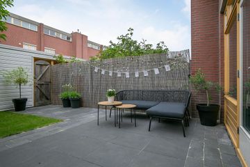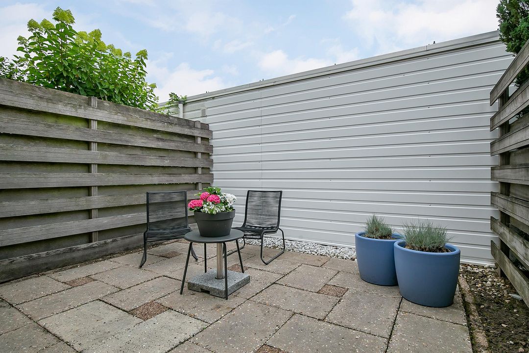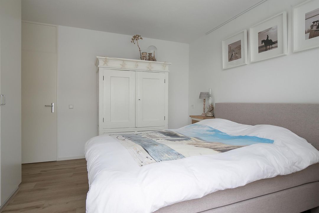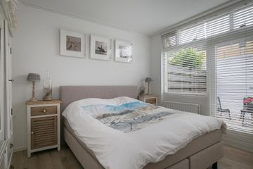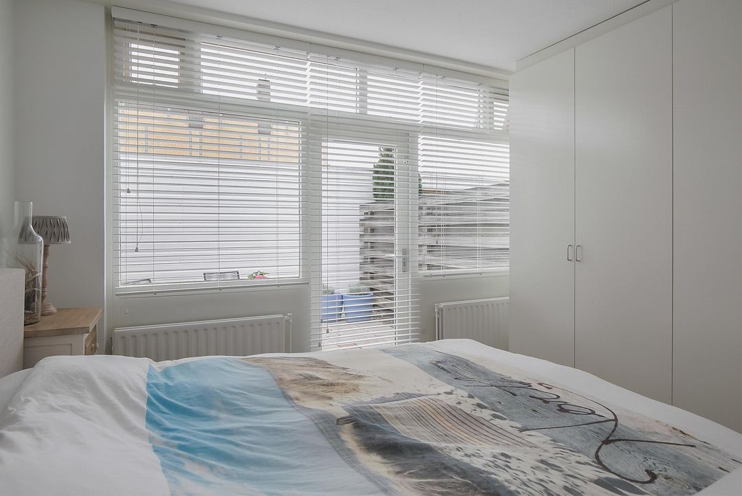Vanuit de hal heeft u toegang tot de slaapkamer. Deze ruimte heeft een zeer prettige lichtinval door de 2 grote ramen en de loopdeur naar de volledig bestraatte tuin (16 m2) op het oosten. De vloer is hier afgewerkt met een lichteiken laminaatvloer en de zowel de wanden als het plafond zijn afgewerkt met strak wit schilderwerk.