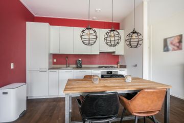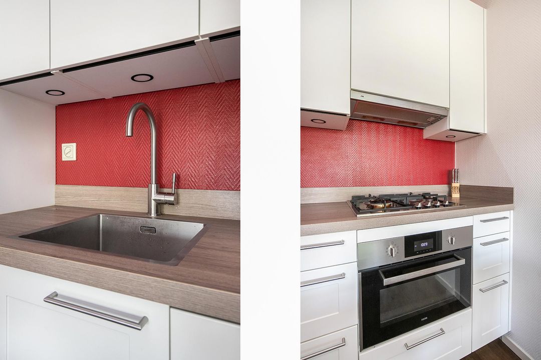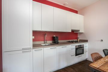 Deze moderne open keuken uit 2020 verkeerd in uitstekende conditie en is van alle gemakken voorzien. De keuken heeft een rechte opstelling met witte keukenkastjes, deze zijn  voorzien van verschillende inbouwapparatuur. Zo zijn er een koelkast, een diepvries, een combi-oven en een vaatwasser aanwezig. Het kunststof werkblad met houtlook heeft een spatrand in dezelfde afwerking, een rvs-spoelbak en een 4 pits gasfornuis met extra wok brander. Ook de knop voor de regulering van het mechanische ventilatiesysteem in het appartement vindt u terug in de keuken.