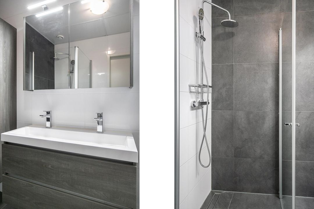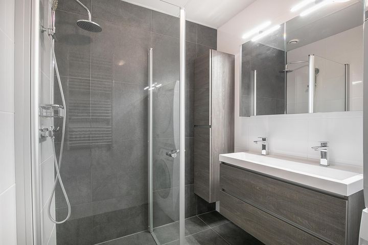 De luxe badkamer (2020) heeft een zeer moderne uitstraling door de combinatie van lichtgrijze en witte wandtegels.  De ruimte heeft een royale inloopdouche met regendouche, een badkamermeubel met dubbele wastafel, spiegels met ledverlichting en een designradiator. Daarnaast kunt u de ruimte snel en eenvoudig ventileren middels het mechanische ventilatiesysteem.