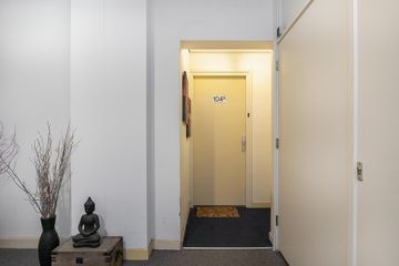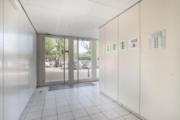 Aan de voorzijde van het complex treft u de parkeerplaatsen en heeft u toegang tot de centrale entree met het bellentableau, de brievenbussen, de liftinstallatie en het trappenhuis.