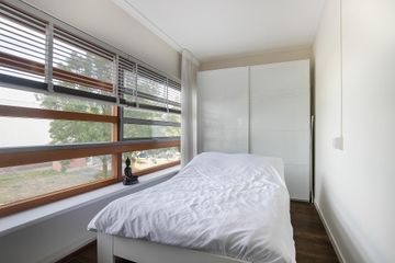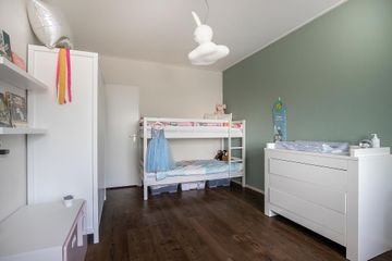 De hoofdslaapkamer is nu ingericht als kinderkamer en is zeer ruim van opzet.  De kamer wordt perfect belicht door het aanwezige raam en heeft een strakke afwerking op de wanden. In deze kamer is er gekozen voor een combinatie van witte en lichtgroene wanden. De tweede slaapkamer betreedt u via de woonkamer en is gesitueerd aan de achterzijde van de woning. Ook hier zijn, net als in de woonkamer, grote raampartijen aanwezig waardoor u hier een prachtig uitzicht en een zeer prettige lichtinval heeft! De kamer heeft een volledig witte afwerking op zowel de wanden als op het plafond.