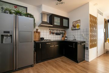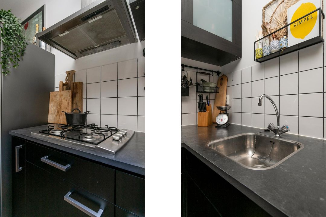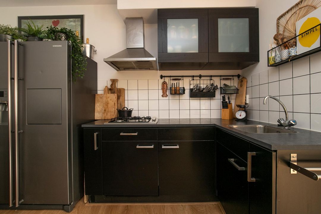 De keuken met een l-opstelling is afgewerkt met zwarte panelen op de opbergkasten. Het donkergrijze werkblad heeft een rvs-spoelbak aan de kort zijde, met een 4 pits gasfornuis aan de lange zijde. Boven het gasfornuis heeft u een rvs-afzuigkap en over de vaat hoeft u zich geen zorgen te maken. Dit kunt u eenvoudig regelen met de ingebouwde vaatwasser. Naast het keukenblok heeft u ruim voldoende ruimte voor een Amerikaanse koelkast en/of een extra kast voor opbergruimte.
